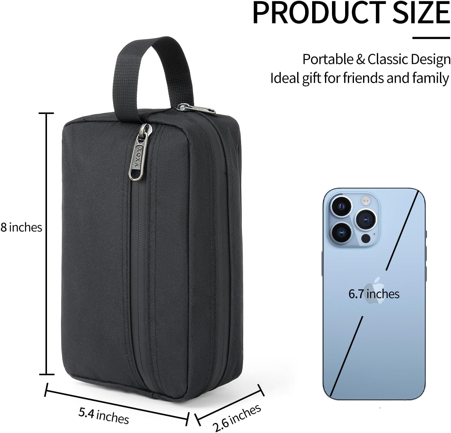 Large Capacity Travel Toiletry Bag: Size 8 x 5.4 x 2.6 inches. One main compartment could easily fit facial cleanser, electric shaver, travel shampoo, toothbrushes and other toiletries. The outside zipper pocket to store all of your little toiletries without getting disorganized Quality Material Toiletry Bag: Mens travel toiletry bag exterior is made of cationic oxford fabric and the interior is made of waterproof pu leather with thickness. Durable and smooth zippers make it easy to close bag firmly. Lightweight, breathable and quick-drying Easy to Carry: travel toiletry bag with convenient side handle which makes it easier to carry and hang. When you are on a business trip or traveling, you can put your toiletry bag in your backpack or suitcase. This portable bag will satisfy your travel daily needs Multi-functional Bag: There is a zippered pocket on the side to store smaller toiletries and cosmetics. Travel cosmetic bag suitable for holiday, beach or gym. outside sports even daily used. It also can be used as a toiletries bag, wash bag, shower bag, toiletry kit bag, shaving kit bag, makeup bag or medicine bag Great Present Idea: We provide four colors of black, gray, blue and pink for everyone to choose. Great holiday present for your friends and family members