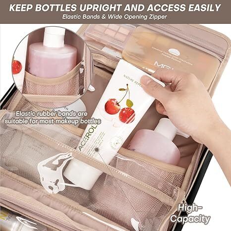 This toiletry bag is a game-changer for travel! The U-shaped pockets fit all my essentials, even bulky bottles, and the hanging hook keeps everything organized. It folds down super slim but holds way more than expected. Perfect size, sturdy material, and so convenient—love how it keeps my makeup and toiletries in one place without the mess. Highly recommend for anyone who travels often!