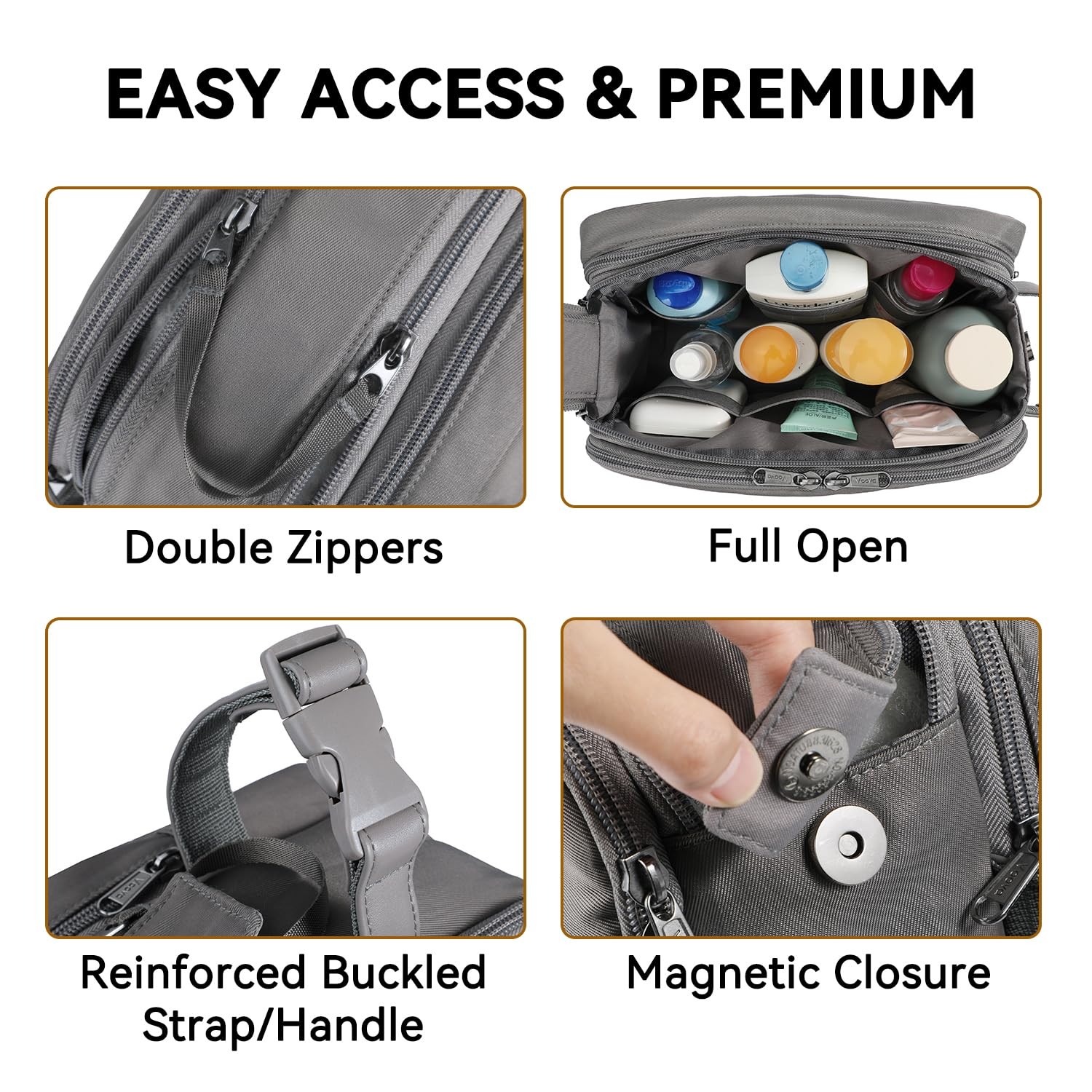Travel Toiletry Bag for Men Women, Hanging Dopp Kit Water Resistant Shaving Bag for Toiletries Accessories, Small Makeup Organizer Case for Traveling Essentials, Bathroom, Cosmetics Large Capacity & Organization: Size:11 x 6.7 x 5.1 inches, main compartment of toiletry bag comes with 6 elastic straps can hold bottles upright and large items such shaving. The side zipper pocket with elastic bands and mesh pockets which can be laid flat and keep your hygiene items secured while traveling or at home, multiple pockets design make this travel toiletry bag easy to organizer all your toiletries neatly. Easy to Carry: The handle of the small toiletry bag adopted a clip-on buckle, detachable, it makes the travel bag to carry easier and can hanger on anywhere so you can easily access this dopp kit in hotel rooms, bathroom, and showers.The compact design means the toiletry organizer can be easily packed into the luggage or backpack, do not take up much space. Convenient to Use: The men shaving kit bag features a large opening and unique double zipper design, which allows for easy access to all inside contents without any fuss. Just pull on the connected zip puller for full exposure. Water-Resistant Material: The travel makeup bag is made of water-resistant fabric, durable, no smell, add pad inside which can keep upright at any time. Also the toiletries bag comes with a wet/dry separation that allows you to keep damp/wet items from dry toiletries, never worry about spills ruining your other belongings.The front panel can be laid flat, conveniently organize your items. Multipurpose Travel Pouch : Modern and stylish design is fit both men and women to used as a traditional toiletry bag, wash bag, dopp kit or makeup bag all in one. The fantastic capacity is enough to your healthcare, toiletries while traveling, flights, hotel stay or daily used and helps you stay organized.