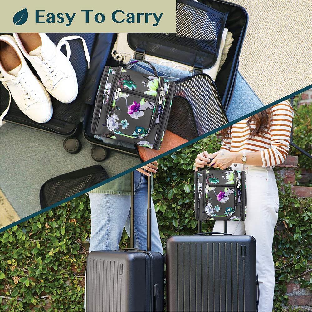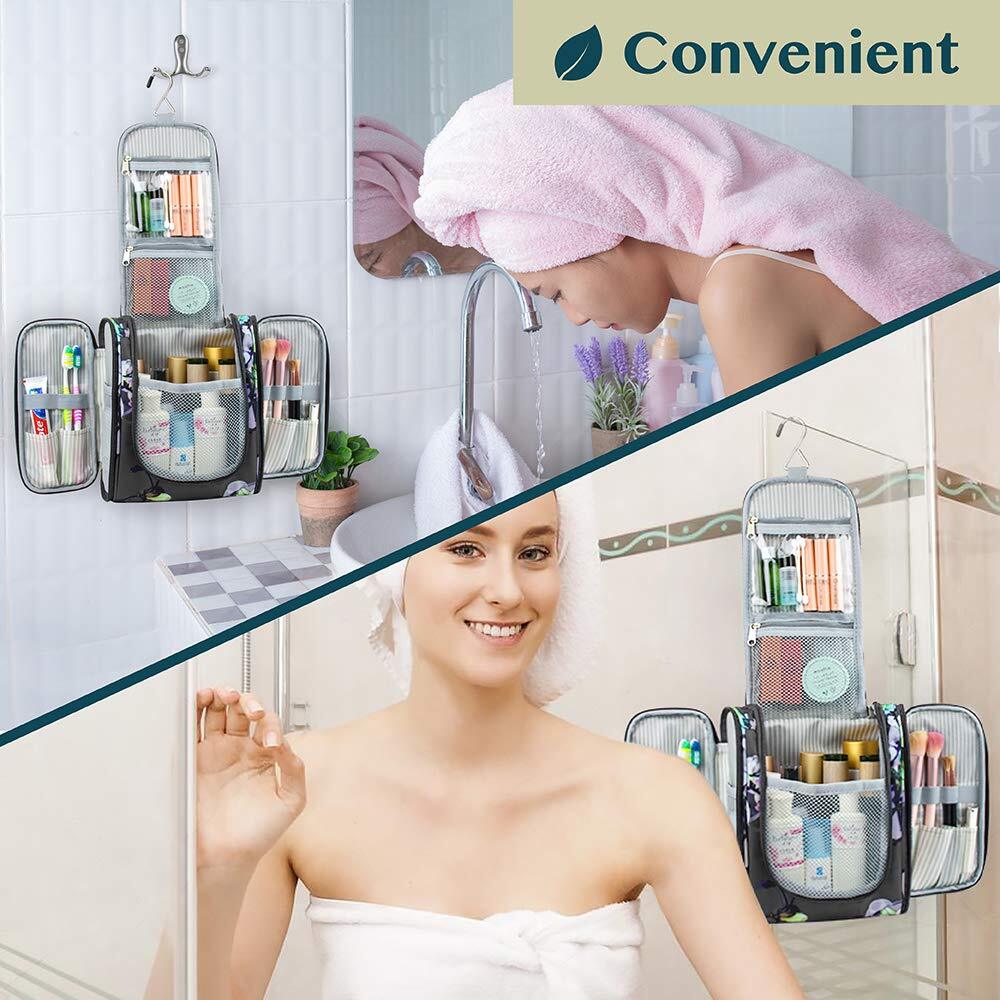 HANGING TRAVEL TOILETRY BAG: PAVILIA large travel bag toiletry organizer case has a large central compartment and two side pockets to fit all your travel toiletries containers, makeup, and cosmetic bottles. Main compartment has 6 mesh pockets to fit skincare bottles, shampoo while side smaller pockets are designed to hold make up brush, toothbrush. This is a travel must have for vacation, flying, gym, cruise, and home. Generously sized at 9x4x9 inches (LxWxH). COSMETICS TRAVEL BAG ORGANIZER: This toiletry bag for women has a hanging hook and multiple pockets that help you stay organizer during business trip, vacation travel. The hanging hook makes it easy to hang the toiletry bag to bars in the hotel shower bathroom. Unzip your toiletry bag to reveal compartments to organize your shampoo, skincare face hygiene products. This toiletry travel bag is an essential accessory for cruise in Europe, plane, Hawaii Trip, and honeymoon. PADDED MAKE UP BAG CASE: The toiletry case bag for men has foam padding that protects toiletries container, shampoo bottle during flying, roadtrip, and plane. The toiletry bag kit also has elastic bands that secure makeup brush, face spray, lipstick, shaving razors. One waterproof compartment for wet toiletries. This large hanging toiletry bag holder for women will protect all gear, cosmetics, and travel gadgets. PACKABLE TOILETRY BAG GIFT: Large and portable, this compact hanging toiletry bag is perfect for business trips, traveling, gym shower, camping, dorm, home use. Easily fit this in any luggage and suitcase. This is a great travel toiletry gift set for travelers, women, men, flight attendants during Birthday, Christmas, holidays, and vacation. Also makes a great gift for mother, father, friend,wife and husband gift during Valentine Day. EASY TO CLEAN: Simply wipe clean with damp cloth to maintain the toiletry bag travel bag. With its water resistant polyester fabric and waterproof compartment, this travel kit for women keeps your travel-size item, shampoo, conditioner, lotion, face wash, medicine, toothpaste, toothbrushes, hair brush and daily makeups protected and organized for every trip, cruise, flight! A must have for every travel packing list!