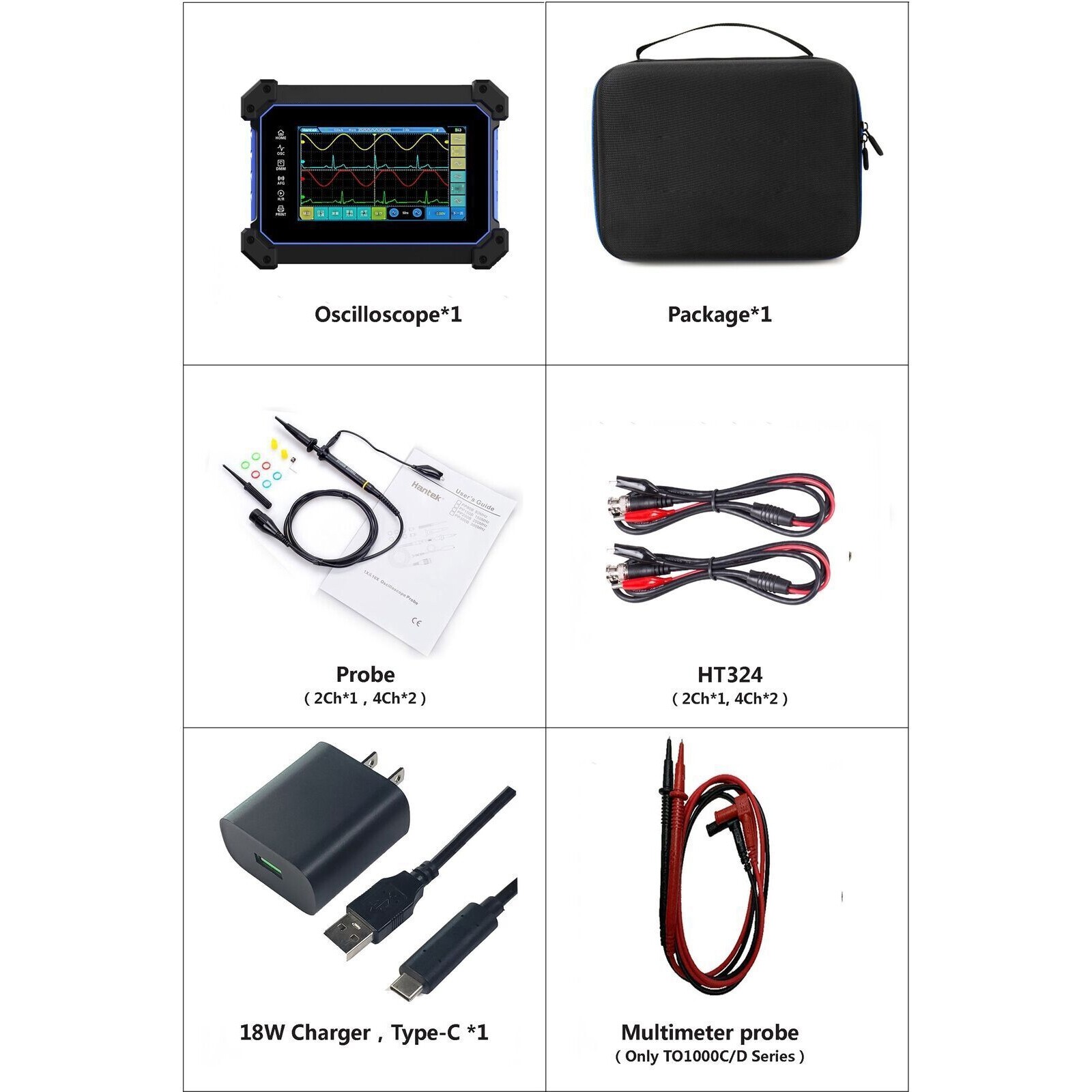 Feature ●Multi touch large screen, resolution up to 800 * 480, friendly and easy-to-use UI, good interaction experience. ●Standard configuration of 4 or 2-channel oscilloscope, maximum bandwidth of 250MHz, maximum sampling rate of 1GSa/s, 8M large storage. ●Provide high-precision multimeter with data recording, storage, trend chart, statistical analysis and other functions. ●A variety of arbitrary waveforms are built into the signal generator, and the highest output frequency is 25MHz. ●One key waveform storage, convenient and fast. ●Suspension foot design, multi angle adjustment, anti falling and anti-seismic, put it on the go. ●Built in super large capacity lithium battery, full power, long endurance, standby for up to half a year. ●The standard 18W charger supports type-C fast charging, and can also share a set of charging equipment with mobile phones.