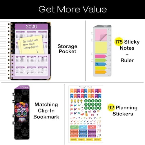 This planner is absolutely perfect! The sugar skull design is gorgeous, and the size is ideal for carrying everywhere. I love the bonus sticky notes and pocket folder—so handy for keeping organized all year long.