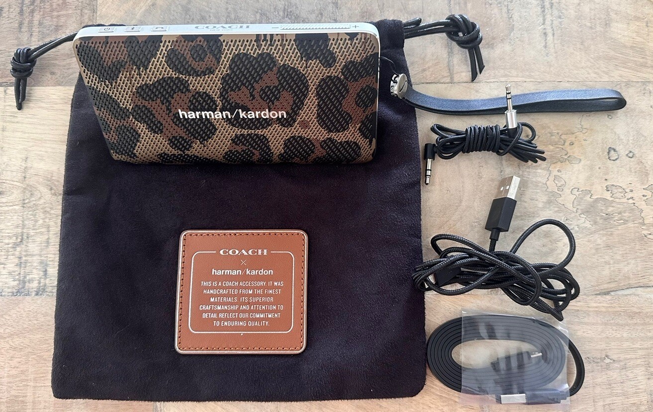 INCREDIBLE SOUND FOR A MINI SPEAKER IT HAS NO SCRATCHES OR DENTS ANYTHING IT IS NEW! WITHOUT A BOX The LIMITED EDITION Harman Kardon Esquire Mini COACH Edition is one of the most luxurious portable speakers I’ve ever used that not only looks great, but also sounds great for such a slim design. This limited edition speaker is based off the regular Harman Kardon Esquire Mini except that features an exclusive COACH designed face as well as the recognizable COACH branding on the rear and along the edge of the speaker. And with anything COACH, it even features a leather finish on the rear to complete the look. To top off its high end design, the Harman Kardon Esquire Mini COACH Edition features a unibody design that gives the speaker a really nice solid feel. In terms of sizing, its height and width are similar to that of an iPhone 6/6s or similar phone with a thickness around 24mm. This makes it one of the thinner portable speakers I’ve used that actually fits into my back pocket, if I wanted to carry it around with me like that. So how does this thing sound? Well, you might think that the thin size would affect the way it sounds, but it really doesn’t. The Esquire Mini is just as loud as any other portable speaker I’ve tried with sounds that are both crisp and clear. It’s loud enough to fill an entire room. It even outputs a decent amount of bass for its size. It’s not deep deep, but it’s deep enough for most music genres. For those who use these speakers while your working, you can also use the Esquire Mini is a speakerphone. It features dual microphones with built-in echo and noise cancellation technology. Aside from its usage as a portable speaker and speakerphone, the Harman Kardon Esquire Mini can also be used as a battery charger for your smartphone. If there’s still juice left in its 2000mAh rechargeable battery, you can plug your charging cable into the speaker to charge up your device. That makes the Esquire Mini quite versatile. It’s a feature I’ve only seen in a handful of portable speakers here and there.