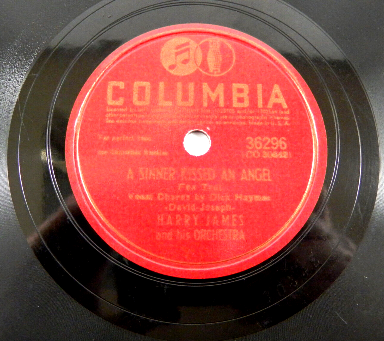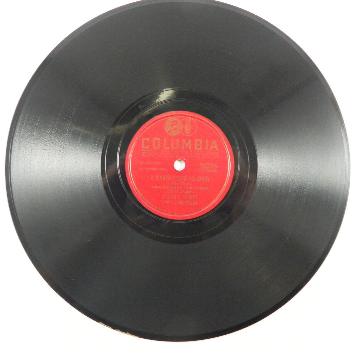 Harry James "You Made Me Love You / A Sinner Kissed An Angel " Col 36296 78RPM Play graded; fully tested. Condition: V ; Moderate, even wear throughout, but still very playable. Surface noise and scratches audible but not intrusive. Label: Columbia - 36296 Format: Shellac, 10", 78 RPM, Repress Country: US Released: 1942 Genre: Jazz Style: Big Band, Swing For shipping: Records are cleaned and placed in a sleeve, and then into a plastic bag for protection against moisture. Then two cardboard squares are placed on each side of the records, making a sandwich, then taped together. Next, two layers of bubble wrap around the record sandwich. Using a 14x14x4 (or similar) box depending on the number of discs, more bubble wrap is placed on the bottom of the box, and then the record sandwich on top, adding more bubble wrap above that. The empty spaces are filled with packing peanuts or similar and the box sealed. Reduced shipping available when purchasing multiple records! See many more similar records in our store!