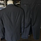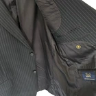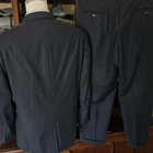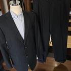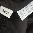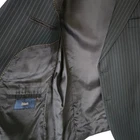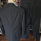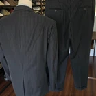 Size: 46r USA with 25-inch arm length and a jacket length of 31 inches. Pants: 37x28 For complete measurements, see photos #2 and #3 To see exactly how we measured, see the last series of photos. Extra fabric for adjustments: Waist: 3 inches Inseam: 1.5 inch Arms: 1 inch Condition: excellent condition. No holes, no snags, no stains, no smells. No flaws. 4 inch lapels, light shoulder pads, black pinstripe, single vent, light to mid weight Return policy: We offer free shipping and no returns. We can not afford to offer both in the highest return category on eBay. It becomes very expensive to mail out items for free for people to try on if they are not confident in checking the measurements in picture #2. If you prefer to have the ability to return the item and pay $12.95 shipping, please send us a message, and we can change the listing format to offer returns. The $12.95 shipping cost would break us out even in the case you needed to return the item. We ship the next business day after the payment is made.