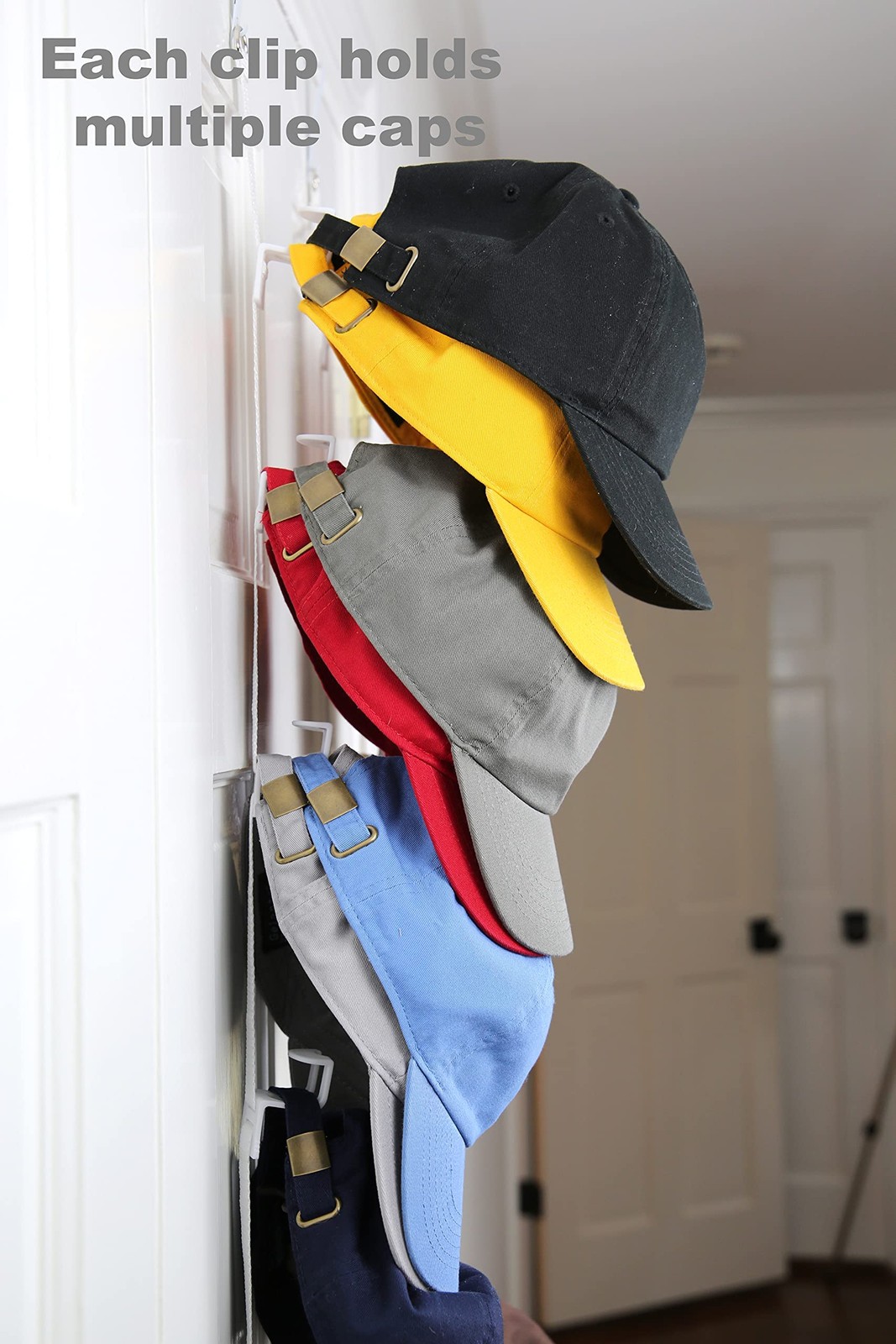 HOLDS UP TO 40 CAPS: Store and organize fitted caps, adjustable caps, and visors over-the-door or on a wall. Comes with 2 straps and each strap has 10 adjustable CapRack hooks. Double-up on each hook and hold up-to 40 hats and visors! Caps will not fall off – door slam proof. 🧢✨ Effortlessly Store Up to 40 Caps! Our CapRack features two durable, flexible straps and 20 adjustable hooks (10 per strap), perfect for holding 20 caps or visors. Need more space? Double up on each hook to easily store up to 40 hats and visors. Maximize your storage and keep your collection organized with this versatile solution! 🧢✨ Never Lose a Cap Again! Our innovative, patent-pending CapRack hooks guarantee your caps stay securely in place, even fitted caps, when you close or slam the door. Say goodbye to fallen caps and hello to ultimate convenience! 🧢✨ Versatile Usage Across Multiple Rooms. The Cap Rack FAV includes two separate, flexible straps, making it perfect for use in various spaces such as your bedroom, laundry room, game room, mudroom, dorm room, and more. Enjoy the convenience of using the straps in different rooms to keep your caps organized wherever you need them. 🧢✨ Perfect Fit for Most Doors. Our flexible straps come with a durable metal adjustment buckle, ensuring a secure fit for doors up to 80" in height. Unlike others, we avoid elastic, guaranteeing that the straps remain snug and tight against your door for maximum stability. For longer doors, you can use a string to connect the bottom of our strap to the top of an under-the-door hook, or contact us for further assistance. 🧢✨ No Assembly Required. Our product includes over-the-door and under-the-door hooks, designed to fit most standard 1 3/8” thick residential doors. The silver hooks feature protective tape on the inside to minimize scratching. If your doors are thicker than 1 3/8", please contact us for a larger set of clips. 🧢✨ BUY WITH CONFIDENCE: Inc is a USA based company celebrating over 30 years in business – with its original owner still in charge. We provide a 100% anytime satisfaction guarantee. If you ever have any questions or concerns, please let us know so we can make it right. We thank you in advance for trusting us with your business.
