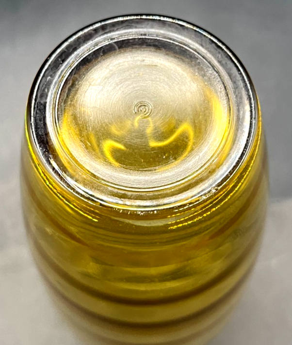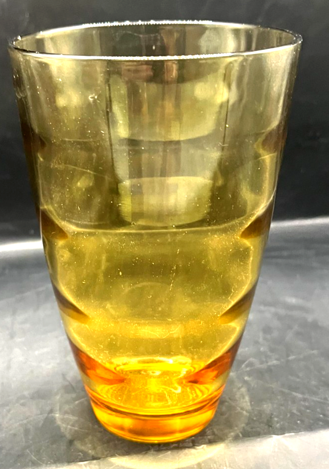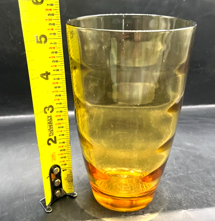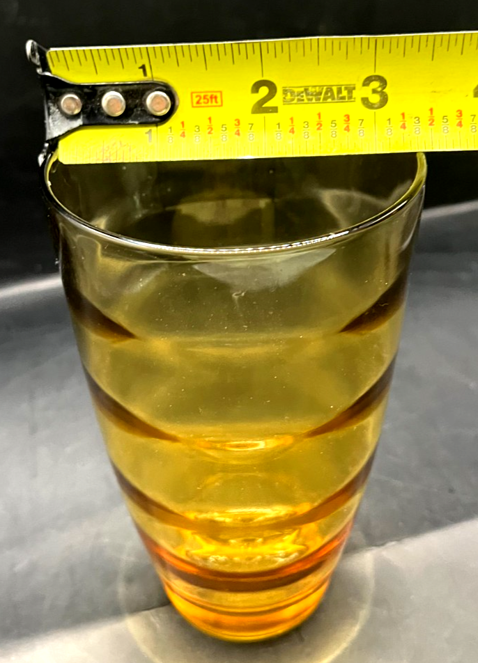 The Hazel Atlas Waterfall Gold Tumblers are a set of four vintage 1970 drinking glasses made of amber glass. Standing at 5.5 inches tall with a 16 ounce capacity, these round tumblers feature a unique Waterfall Gold pattern with circular rings inside the surface. Manufactured in the United States, these original tumblers are perfect for all occasions and add a touch of retro charm to any drinkware collection. The Hazel-Atlas brand is known for its quality and craftsmanship, making these tumblers a desirable addition for collectors of vintage glassware.