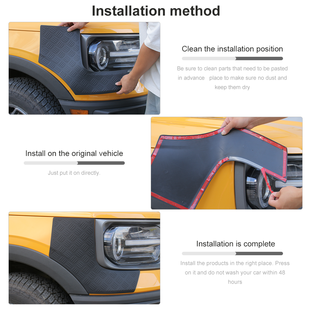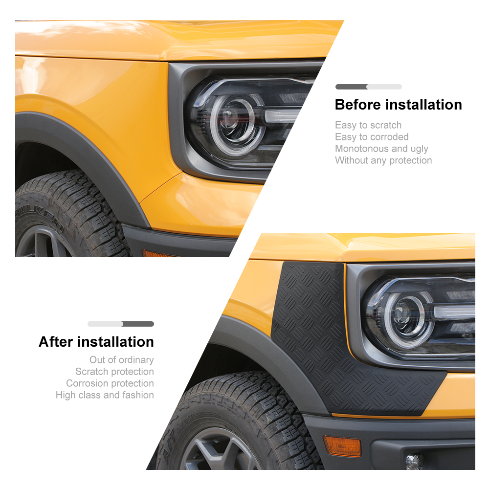 1, FREE SHIPPING WITHIN 24 HOURS!!!(Except weekends and holidays) 2, CONTACT US IF YOU WANT TO MIX AND MATCH FREELY AND YOU WILL GET THE VIP DISCOUNT - Please confirm your car model is as same as the picture before submitting your order - Notes: this is a decoration cover trim not the original car replacement trim NOTE- In case it fall off for some car models, just add some tape and put the cover back on,then they will work perfectly After receiving the product, you can first compare whether the size is correct and make sure it is correct before installing it. If it is not correct, you can contact us to help you check and solve it. No matter what problem you encounter, you can contact us as soon as possible (use the contact seller), we can provide you with better after-sales service Front Fender &Taillight Corner Armor Cover Panel Guard For Ford Bronco Sport 21+ Product description About CheroCar Company: --Our CheroCar Company Ideas ☀Always adhere to the customer first, quality first, service first. --Production Control ☀All products are produced after repeated proofing, test and small batch production, in order to let the products received by all customers are the most perfect and most suitable. ☀CheroCar all products have the QC in each process for inspection, the quality can be guaranteed accordingly. Fitment pls view the title Features - Material: Made of High Quality Plastic - Paint Baking and UV Treated on surface - Easy installation with double-sided tape - Color: as picture showed - it was not the replacement part. - Please confirm your car model is as same as the picture before submitting your order - NOTE- In case it fall off for some car models, just add some tape and put the cover back on,then they will work perfectly Package include: as the picture shows Installation Guide: Step1: Please clean the installation place and keep it dry and no dust on. Step2: Tear off the self-adhesive on the back. Step3: If the weather is below 15 degrees,you may need to heat the Self-adhesive with a hair dryer for better adhesion. Step4: Do not wash the car within 48 hours after installation. Attention: If you do not want,you can remove it easily.No glue left or you can erase it. Payment Return Shipping About Us FAQ Payment Payment Information Immediate payment is required upon selecting "Buy It Now" or upon checking out through the basket. We only accept payment via PayPal. When making a payment to us via PayPal, you can use your existing PayPal account. No financial information, passwords, credit card numbers or personal information other than your name, email address and shipping address is received by us. Although PayPal is extremely secure, Jecar is not responsible for protecting the personal information you share with them. You are encouraged to read the related PayPal policies carefully. Promotional:Please note that website discounts, coupons, and gift cards are not valid for use on eBay. Return -We hope that you will be pleased with your order. However, in the event that your order is not suitable, we are happy to accept returns for a refund (excluding postage) or an exchange with 30 days of purchase. -It is very important that you include a note with your eBay ID, name, reason for returning and return requirements. -In the event of a return, the customer is responsible for postage costs. It is highly unlikely that a product may be faulty, however in the case returning postage will be refunded on arrival. Exchange and Refund Process Returns are handled on a daily basis therefore your exchange or refund will be posted on the day that your return arrives; you will also receive an email to confirm this. Exchanges will be posted to the address associated with the original order (unless otherwise stated) and refunds will be issued to the original payment method only. PLEASE NOTE: All products that have been used or original packaging is incomplete will be charged 25% restock free Shipping Delivery Information: All orders are dispatched within 1~3 working day upon receipt of payment. This is an insured and tracked service with a transit time of 1-5 working days depending on postal service selected. Delivery times may vary, especially during peak periods. We currently ship to the United States. About Us Welcome! Welcome to TESIN, one of the fastest-growing online retailers of automotive parts and accessories today! We're proud to offer all of the leading brands in performance gear, interior accessories, and style upgrades, at prices suitable for any budget. Most importantly, we back every one of our products with the best one-on-one customer service you'll find anywhere. Customer Service Forget about those faceless online stores that hide behind hard-to-find contact info and robotic phone menus. At TESIN, serving our customers is priority number one. That's why, when you give us a call or chat with us online, you'll be communicating with a real person right here in Illinois. Whether you have questions about a particular product, want to place an order, or need to return an item, our experienced sales and service staff is ready to take your call. After all, YOU the customer are the most important part of our business! Don't just take our word for it, either. TESIN is proud to be a Better Business Bureau-accredited business with an A+ rating, a Google Trusted Store, and a Bizrate Customer Certified Store. With these kinds of credentials, we're a company you can count on. Customer Reviews If you want the most real, road-tested info about one of our products, don't take it from us - let your fellow auto enthusiasts share their experiences with our Customer Reviews. All of our Customer Reviews are written by real Jecar customers who have used our products and want to share their opinions. From fit and finish to performance and durability, our Customer Reviews will help you decide on the perfect parts for your vehicle. FAQ Frequently Asked Questions Q: How do I order? A: You can place your or