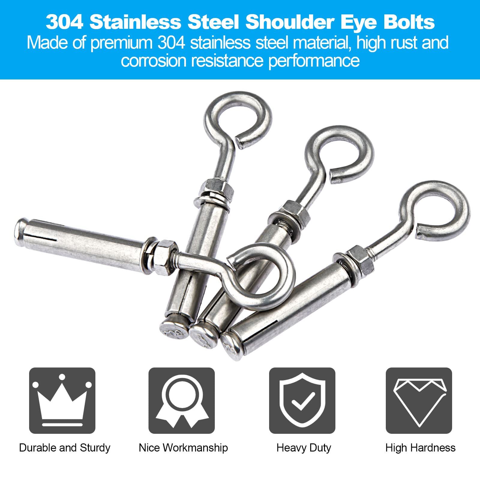 These shoulder eye bolts are fantastic! The 304 stainless steel is super sturdy and rustproof, perfect for heavy-duty use. Installation is a breeze—just drill, insert, and tighten. The smooth finish ensures no snags, and they hold securely in concrete or masonry. Great value for a 10-pack! Highly recommend for anyone needing reliable anchors.