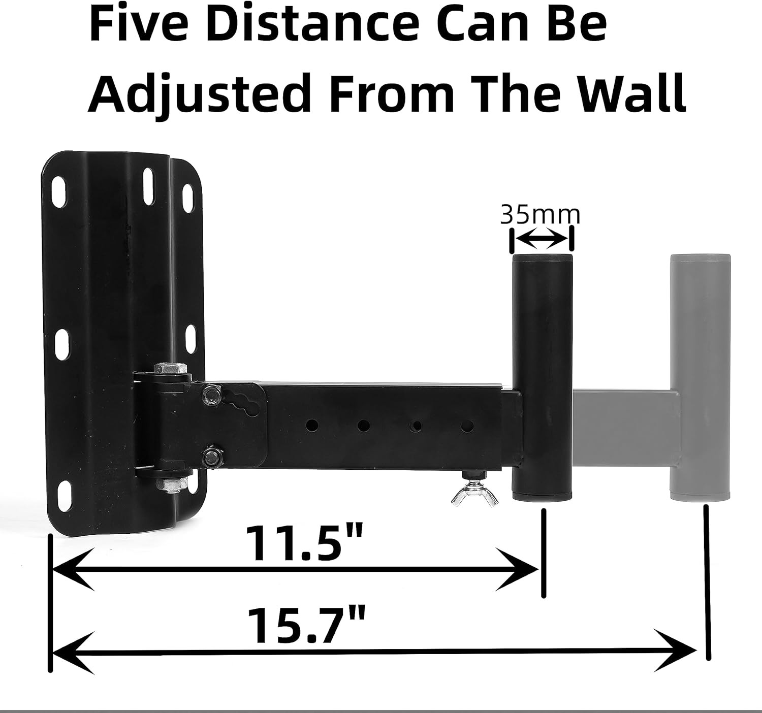 Heavy Duty Speaker Mounts - Support up to 110lbs, Adjustable PA Speaker Brackets, Swivel & Tilt, 2 Packs Black Color Black Compatible Phone Models PA Sperker Mounting Type Wall Mount Special Feature Adjustable Distance, Adjustable Swivel & Tilt About this item 【HEAVY DUTY DESIGN】 Our extra strong metal speaker brackets come with thickened and a larger base.Can hold up to 110lb speaker. 【ADJUSTABEL DISTANCE FROM WALL】 PA speaker wall mounts have 5 adjustable distances from the wall to the center:11.5 inches to 15.7 inches. 【ANGLE ADJUSTABLE】 The speaker brackets can be tilted horizontally or downward 60°(4 positions), level can be adjusted 180° left and right, so that your speakers to obtain the perfect voice angle. 【PACK INCLUDES】 2 x Speaker Wall Mounts and 12 x Expansion Screws,2 x Setting screws,make sure it attaches perfectly to the wall. 【WIDELY USED】The speaker stand wall fixed is designed to work with virtually any PA speakers on the market.Useful bracket to support home theater,bookshelf, satellite speakers etc..Great for office, living room, bedroom, bar, hotel, lobby,studio, school,patio, public areas, and other occasions.