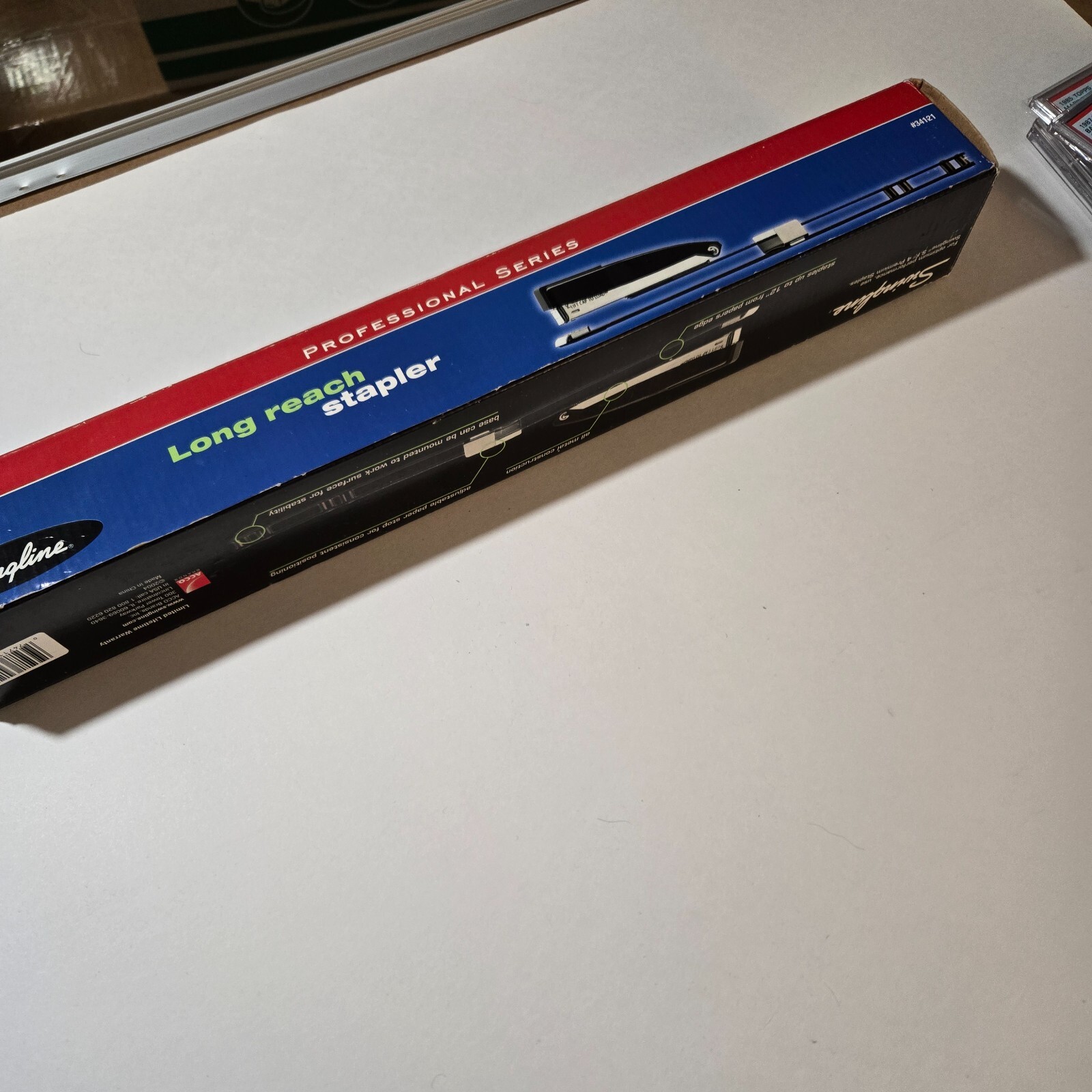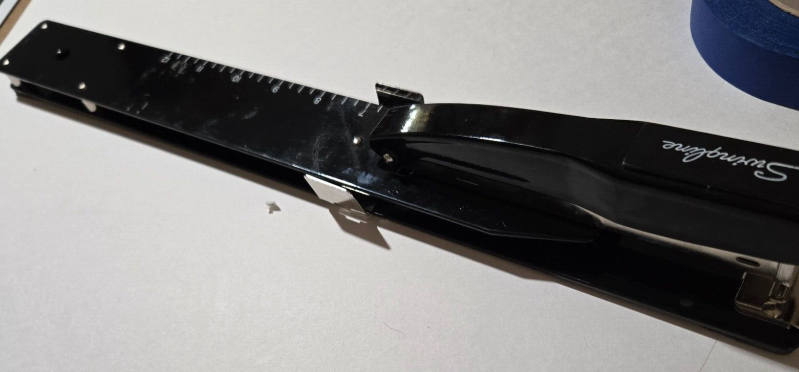 The VTG Swingline 34121 Heavy Duty Black Long Reach Stapler is a professional series unit designed for heavy-duty stapling tasks. With its long reach feature, this standard stapler from Swingline offers extended reach capabilities, making it ideal for reaching distant areas on documents. The unit is a vintage model and comes in a sleek black color, adding a touch of professionalism to any office environment. Perfect for office use, this Swingline stapler is a reliable tool for efficiently binding papers together.