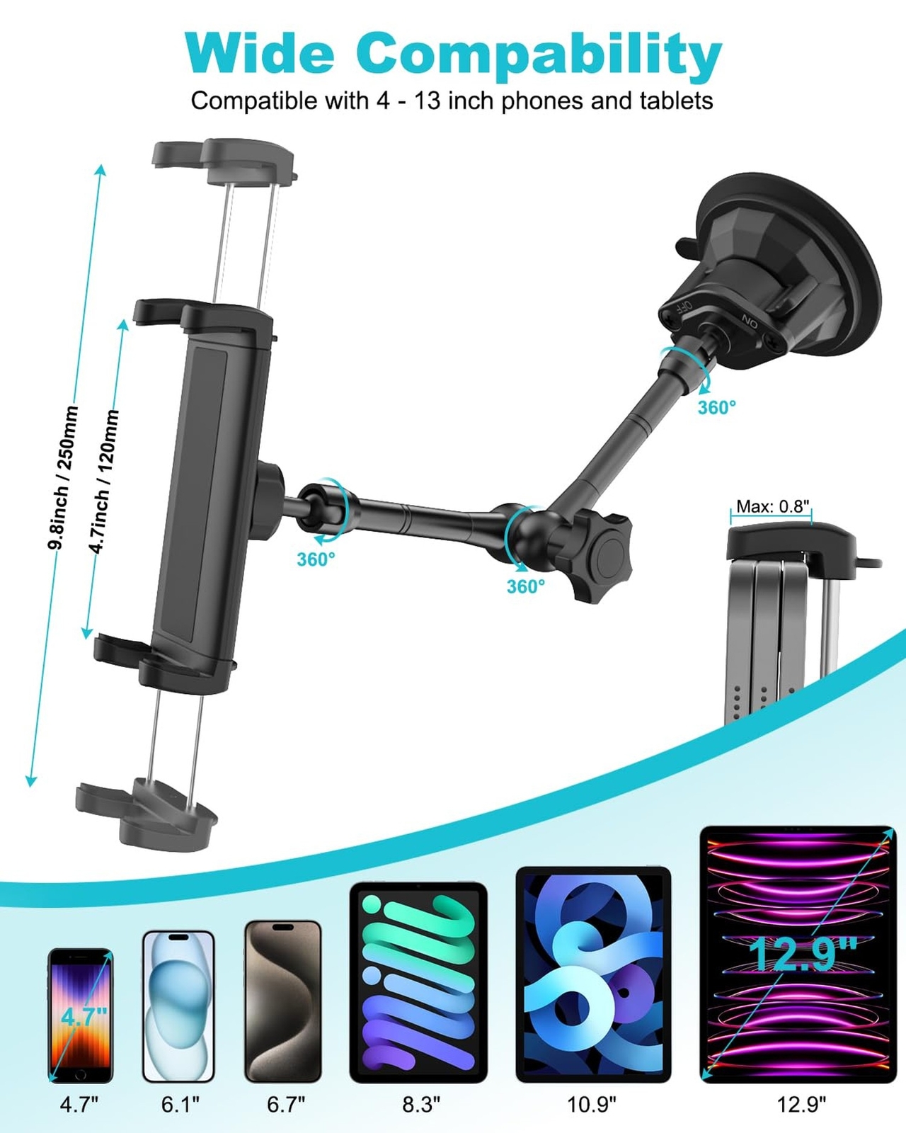 Tablet Mount for Truck Dashboard, [Ultra Powerful Suction Cup] Heavy Duty Car Tablet Holder, Adjustable Metal Arm Semi Truck Windshield Dash Stand for iPad Pro 12.9 Air Mini, Tab, 4-13" Tablets Product Details Brand: Dosvsi Compatible Devices: 2024 iPad Pro 13/ 2022 2021 iPad Pro 11 / iPad Pro 12.9 / 2020 iPad Pro 11 / iPad Pro 12.9 / iPad Pro 10.5 / New iPad Pro 11, iPad mini 2 3 4 5 6 7/ 2024 iPad Air 13 11/ iPad Air 5 4 3 2 / iPad 2020 2019 2018 2017 / iPad 10th 9th generation 6th 5th 4th 3rd generation; Galaxy Tab S9 S8 S7 FE S6 / Galaxy Tab A9 A8 A7 LITE A6, iPhone X / XS / XS Max / XR / 12 / 12 Pro / 12 Pro Max / 13/ 13 Pro / 13 Pro Max / 14/ 14 Plus / 14 Pro / 14 Pro Max/ iPhone 15/ 15Plus/ 15 Pro/ 15 Pro Max/ iPhone 16/ 16Plus/ 16 Pro/ 16 Pro Max and most phones and tablets See more Compatible Phone Models: Compatible with 4"-13" smartphones and tablets, like iPad Pro 13(M4) iPad Pro 12.9, 2024/2022/2021/2020 iPad Pro 11, iPad Pro 10.5 9.7, iPad 9th generation 10.2, iPad Air 5th 4 3 2 1, iPad Mini 6 5 4 3 2, Galaxy Tab S9 S8 S7 S6/A8 A7 A6, Android Tablet, e-Reader, iPhone 16 15 14 13 12 11 Pro Max, iPhone 16 15 14 Plus, iPhone 13 12 Mini, iPhone Max Xs XR X 8s, Galaxy S24 S23 S22 S21, Z Fold, Z Filp, Surface and so on. See more Mounting Type: Dashboard/ Dash/ Windshield/ Windscreen/ Window Special Feature: Adjuatable Arm, Cold Resistant, Hand Free, Vacuum Suction Cup Product Dimensions: 3.94 x 3.74 x 7.48 inches Item Weight: 1.06 pounds Item model number: Car Tablet Holder Special features: Adjuatable Arm, Cold Resistant, Hand Free, Vacuum Suction Cup Whats in the box: Tablet Clamp, Metal Adjustable Arm, Vacuum Suction Cup Manufacturer: Dosvsi Country of Origin: China Date First Available: March 1, 2024 Super Suction CupCar tablet mount adopts a large vacuum suction cup (diameter: 3.34 "), which has stronger suction power than ordinary suction cups. Just turn the knob to lock the suction cup. Even on bumpy and rugged mountain roads, it remains firmly attached to the car and maintains strong suction. Unlike sticky suction cups, vacuum suction cups leave no trace. Works well even in cold or hot weather. (The disk prepared for uneven surface makes the tablet holder fit for more occasions) Driver's Good HelperWindshield dashboard tablet holder is ideal for drivers to view navigation, and professional drivers to handle remote information to better serve long-distance transportation work. Windshield dash tablet holder not only suitable for semi-truck/ flat truck/ box truck/ dump truck/ van/ SUV/ MPV/ bus/ excavator/ RV/ camper/ off-road vehicle, but also for commercial fleet vehicles/ transport truck/ tank truck/ warehouse truck/ aviation/ agricultural transportation. Sturdy & SafeDash tablet mount is made of metal. There are gears on the metal joints to prevent the adjusting arm from shaking and falling. The 10inch/25CM adjustable arm tablet holder has a specially upgraded knob, one knob can control three joints, allowing the arm to fold and lock easilyand the metal ball head supports 360 rotation. It reduce the driver's time operating navigation or tablet. This is friendly for drivers. Provide drivers with a safe and comfortable navigation angle. Wide CompabilityCar glass tablet holder has spring clips that pull out and retract which makes it very easy to put the device in or take it out. Tablet clamp is fit for 4-13" device with thin or thick case, such as iPad Pro 13(M4) 12.9 11, iPad 10.5 9.7 10.2, iPad Air 6th 5th 4 3 2, iPad Mini 7 6 5 4 3 2, Galaxy Tab S9 S8 S7 S6/ a9 A8 A7 A6 Z Fold Series S24 s23 S22 S21, Android Tablet, iPhone 16 15 14 13 12 11 Pro Max, iPhone 16 15 14 Plus, iPhone 13 12 Mini, iPhone Max Xs XR X 8s, Surface.(The clip is equipped with silicone to protect the device from scratches.) High-quality After-sales ServiceDurable materials and ingenious design ensure the truck phone holder is stable and sturdy. All Dosvsi products provide 60 days refund and 12 months manufacturer quality after-sales service, if you have any questions about this product, please feel free to contact us.