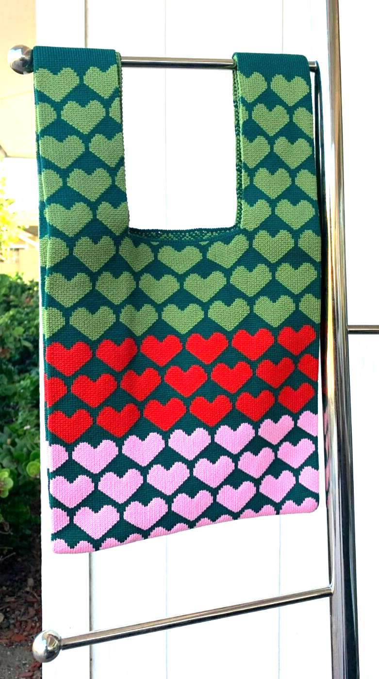Great Looking Small/Medium Poly-Cotton Heavy Knit Tote Bag Pink, Green, Red Hearts on Dark Green background - Very cute and colorful! 2 Non-adjustable 5" straps Not a large bag, but generous inside space Overall: 8"x8" - bottom will expand 2+" as items are placed inside NEW Great gift for someone who likes special bags and totes!