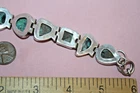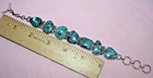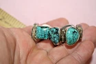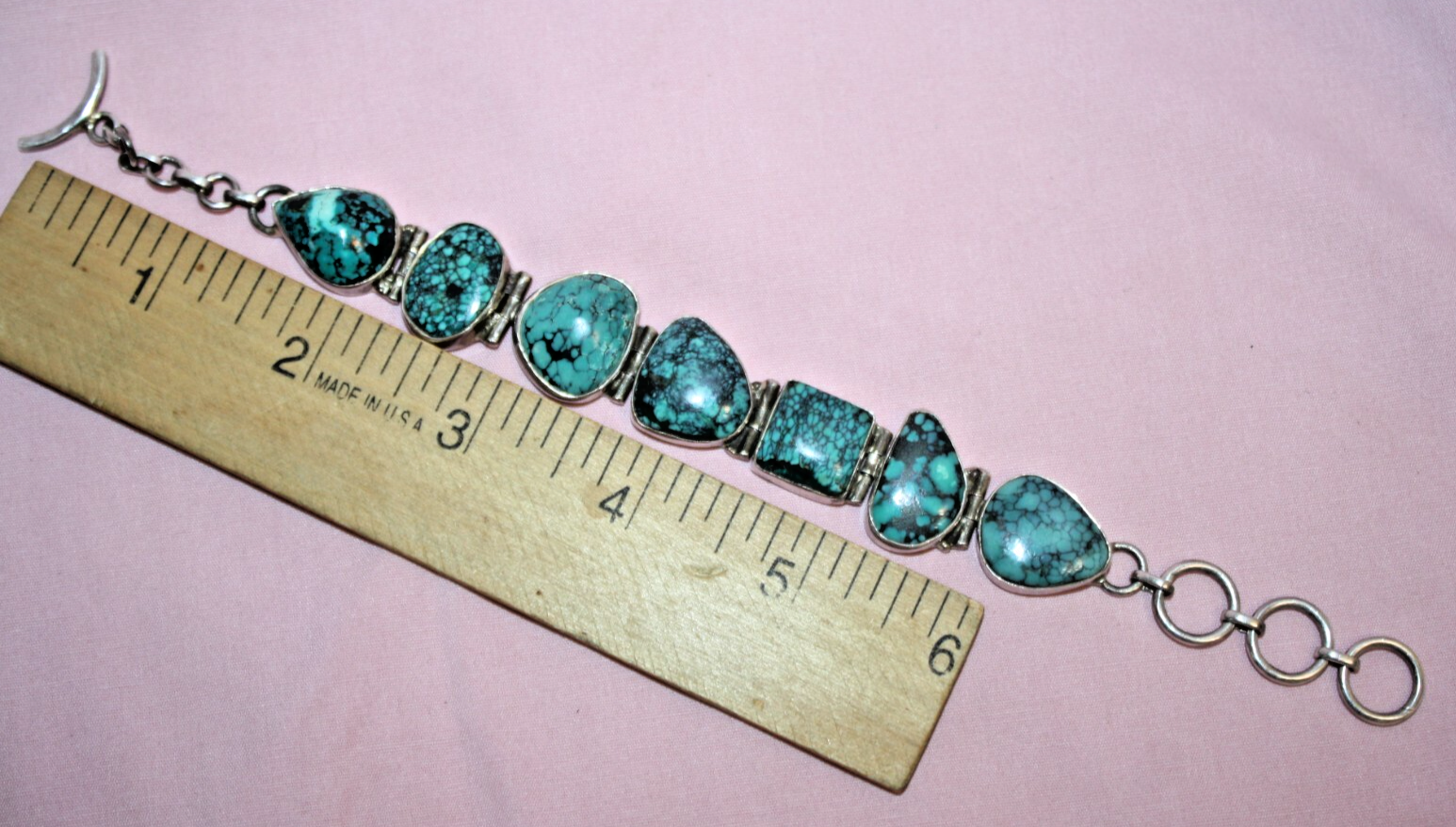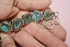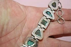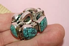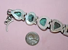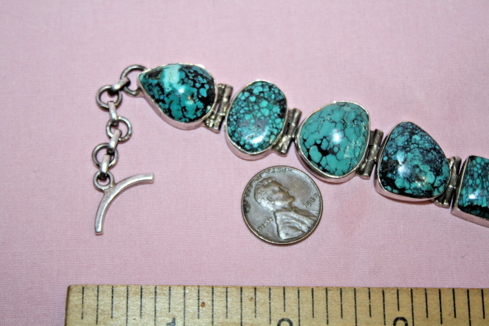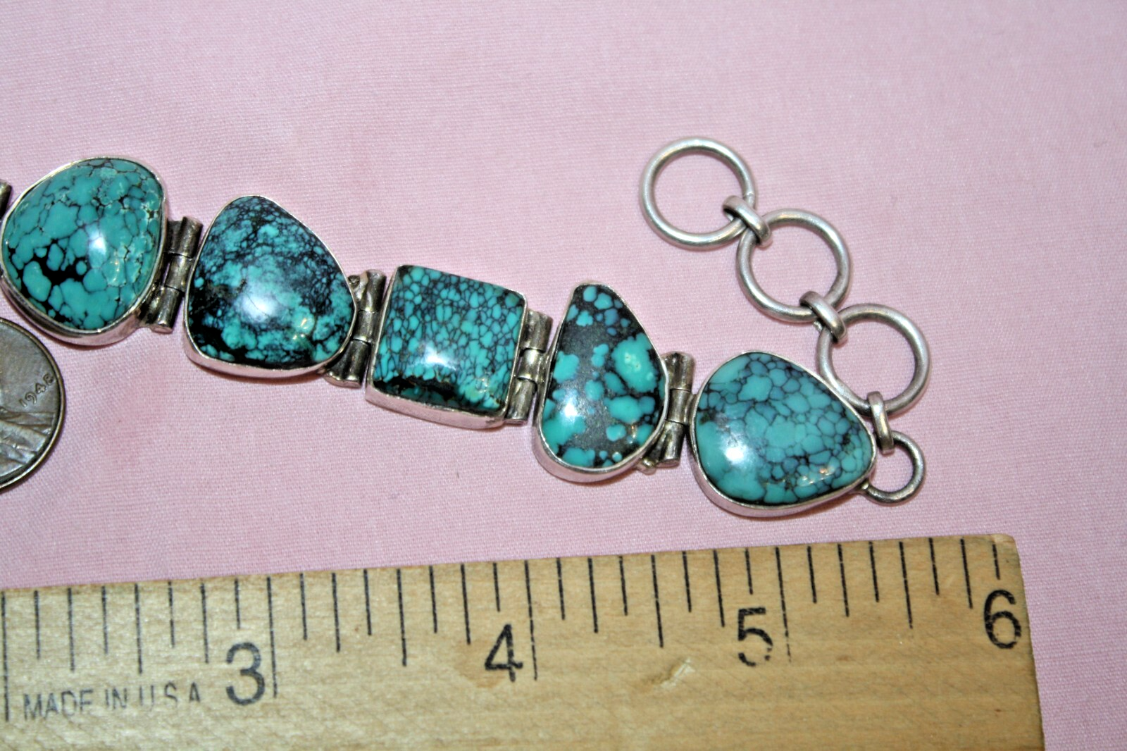Big heavy 37.9-gram toggle bracelet with turquoise green stones. Not sure of country origin of bracelet or stones or of weather stones are natural or manmade. They look nice but not like American turquoise. Marked 925 on reverse 3rd link in from rings end. Tested using JSP and guaranteed sterling silver. Looks artist made but no other markings. 44$ plus 4$ shipping. Please see all pictures and my other listings. Thank You and Good Luck! Rick