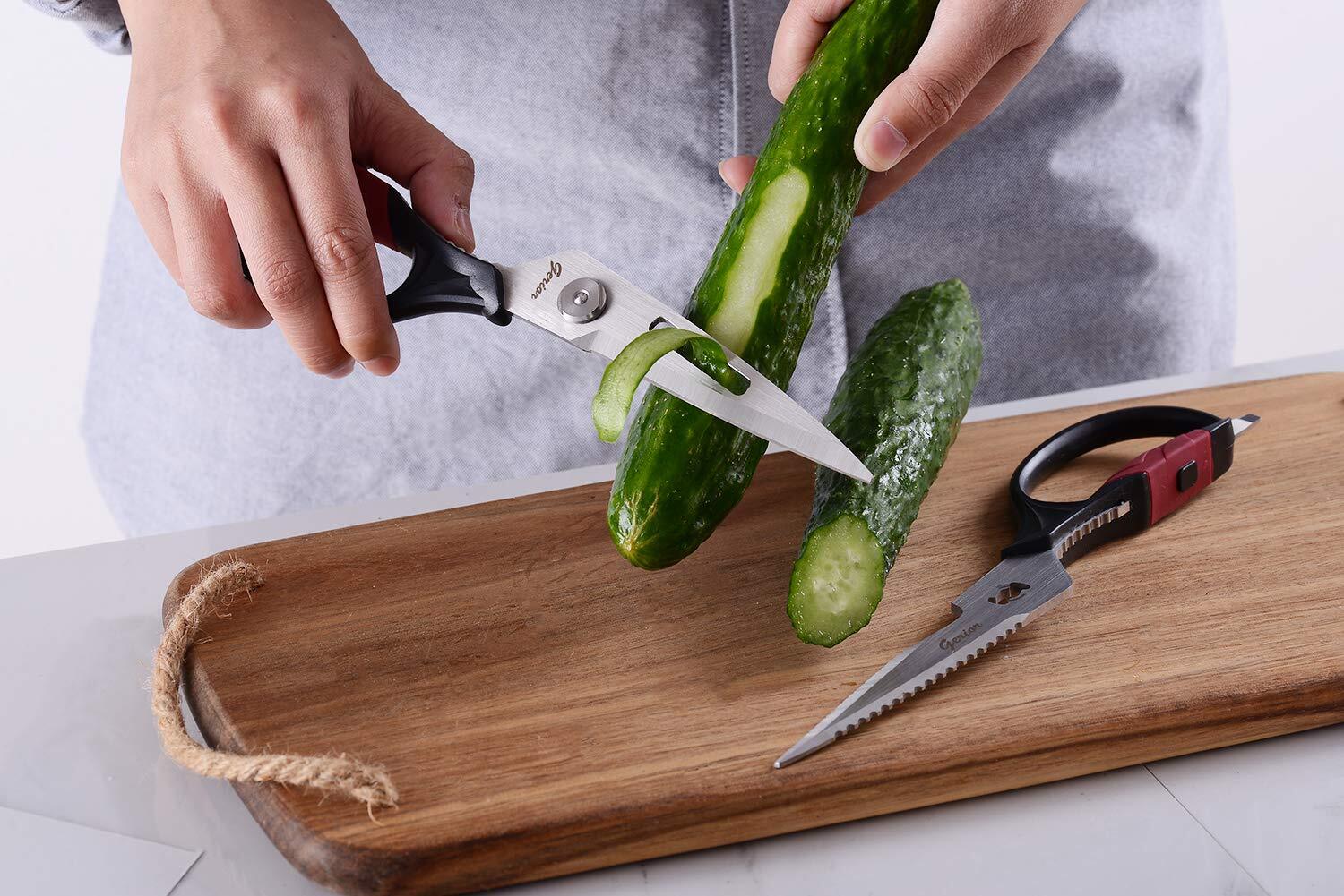 VERSATILE AND EASY TO CLEAN: Kitchen scissors that can be taken apart are the only kitchen scissors sanitary enough for food prep. Being able to separate them apart to clean any food particles that remain in the pivot screw is critical to safe food prep. These kitchen scissors are designed to be easily taken apart. SHARP BLADES, NO RUST: The micro-serrated blade allows for better gripping of slippery materials. The kitchen shears’ blades are crafted from high-quality, food-stainless steel that resists rusting. HEAVY DUTY KITCHEN SHEARS: The blades are extra thick (3 mm compared with 2 mm from other brands) and a large handle for added strength and durability. UTILITY SCISSORS: Aside from the standard kitchen snips, there are also specialty cutters for poultry, fish, and herbs. Include additional features such as a bottle opener, a center-toothed grip for cracking bones and nuts, notches on the handles for jar opening, a screwdriver tip. COMFORTABLE HANDLES: The large, slightly rubbery handles are not only comfortable to hold, but they also reduce on your hands and wrists. Soft, non-slip grips for comfort and safety, even in wet hands.