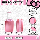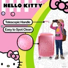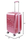 Description Keep your belongings conveniently and efficiently stored in one place while breezing through the airport or hotel lobby with this adorable Hello Kitty pink rolling luggage on wheels. Designed with a stylish, eye-catching Hello Kitty embossed aesthetic, this 8 wheel hard shell carry on luggage features eight 360 degree multi-directional spinner wheels with to allow for smooth travel over all types of textured surfaces, and the lightweight hard sided luggage with spinner wheels features a retractable pull handle so you can reach your destination without hassle. The hard case luggage garment bag a sizable polyester-lined main zip compartment for easy packing, a zip wet dry compartment for personal essentials, 2 mesh zip pockets for small accessories, clothing compression straps to keep clothing from wrinkling, and features expandable storage with 2-inch zipper gusset. The light weight carry on luggage roller features a hard shell ABS plastic case which protects your luggage and is easy to spot clean to keep the carry on luggage with wheels looking stylish during travel. The small size travelling bags with wheels measure 14 W x 8 D x 21 H in inches, and weigh 10 lbs. HELLO KITTY ROLLING LUGGAGE: Pink hardshell luggage with a cute Hello Kitty design; Hardside luggage carrier meets most airline requirements for carry-on luggage and fits into most overhead bins ABUNDANT STORAGE: Hard luggage features a sizable polyester-lined main zip compartment for easy packing, a zip wet dry compartment for personal essentials, 2 mesh zip pockets for small accessories, clothing compression straps to keep clothing from wrinkling, and features expandable storage with 2-inch zipper gusset EASY PORTABILITY: Wheeled luggage features a lightweight upright design with eight 360-degree multi-directional spinner wheels and retractable handle which allows for effortless movement DURABLE: Travel luggage bag features a hard shell ABS plastic case which protects your luggage and is easy to spot clean OFFICIAL HELLO KITTY PRODUCT: Hello Kitty carry on luggage with spinner wheels is an officially licensed Hello Kitty product; Carry on suitcases measure 14 W x 8 D x 21 H in inches, and weighs 10 lbs
