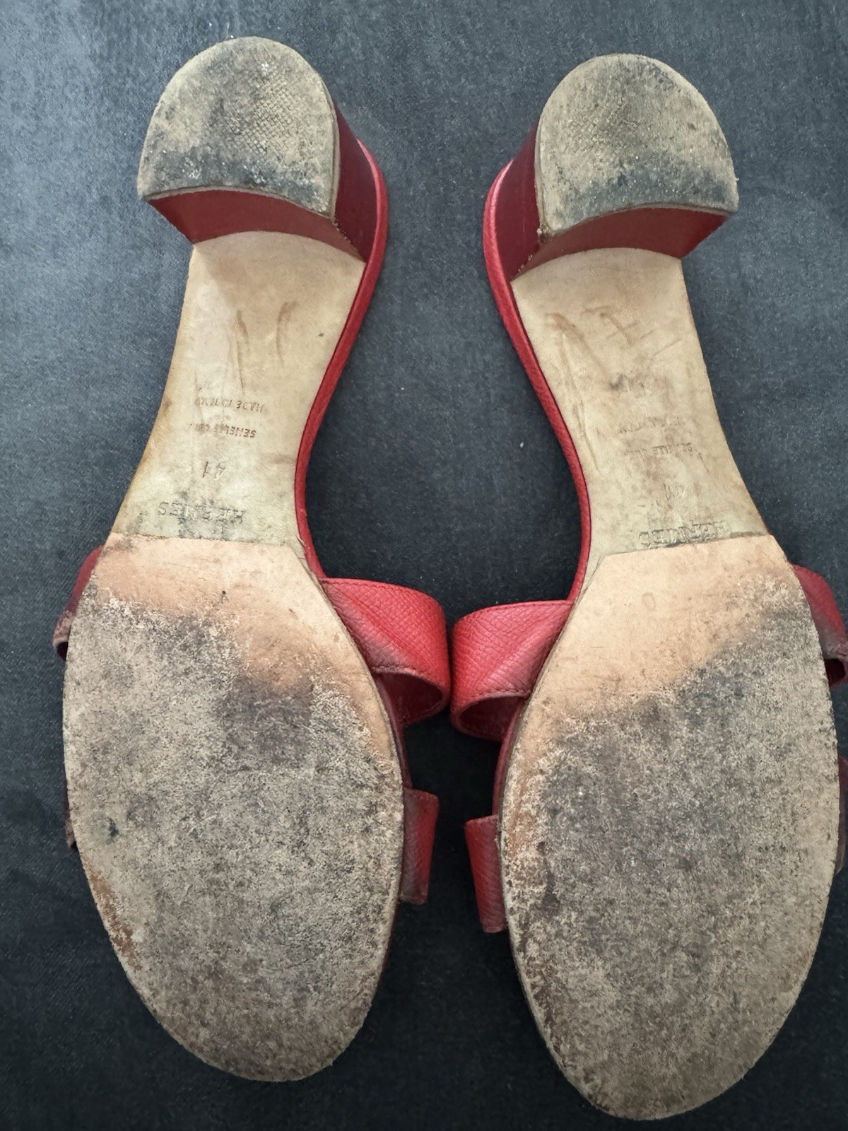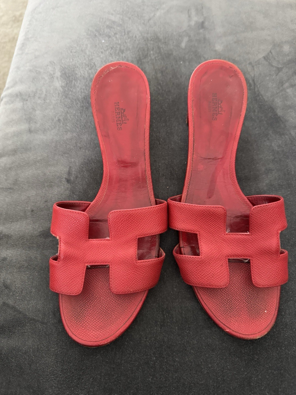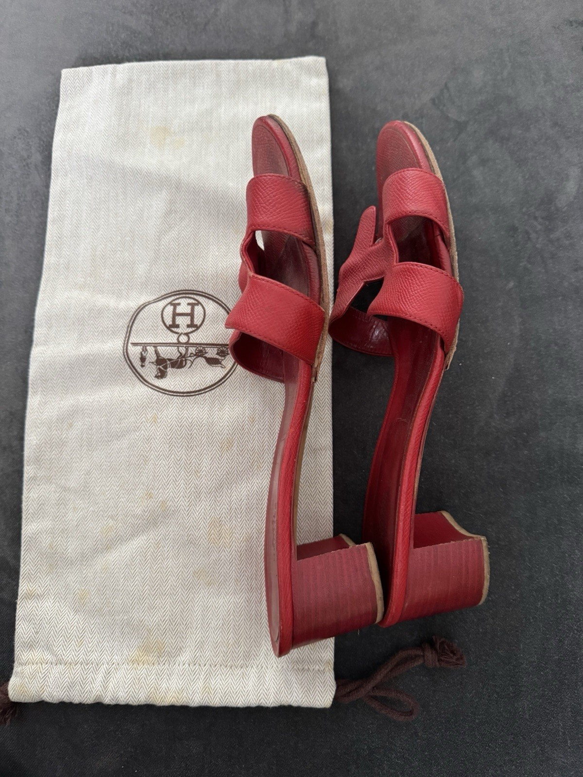 Hermès Red Oasis H Sandals Leather Block Heel Size 41 EU / 11 US - Iconic H Cutout - Made in Italy Description: Authentic Hermès Oasis Sandals featuring the iconic “H” cutout design in rich red leather. Block heel design for added comfort and elegance. A true luxury staple, perfect for everyday chic or resort wear. Made in Italy. Condition: • Pre-owned, with visible signs of wear on the soles and insoles (please review all detailed photos). • Leather uppers in good condition with light creasing and minor scuffs. • Original Hermès dust bag included (shows some stains). Features: • Brand: Hermès • Model: Oasis Sandals • Color: Red • Material: Leather • Toe Style: Open Toe • Heel Style: Low Block Heel • Size: • EU 41 • US Women’s 11 • UK Women’s 8.5 • AU Women’s 11 • Heel Height: Approx. 2 inches (5 cm) • Made in Italy Shipping: Ships within 1 business day. Comes with Hermès dust bag. Please review all photos carefully before purchasing. No returns.