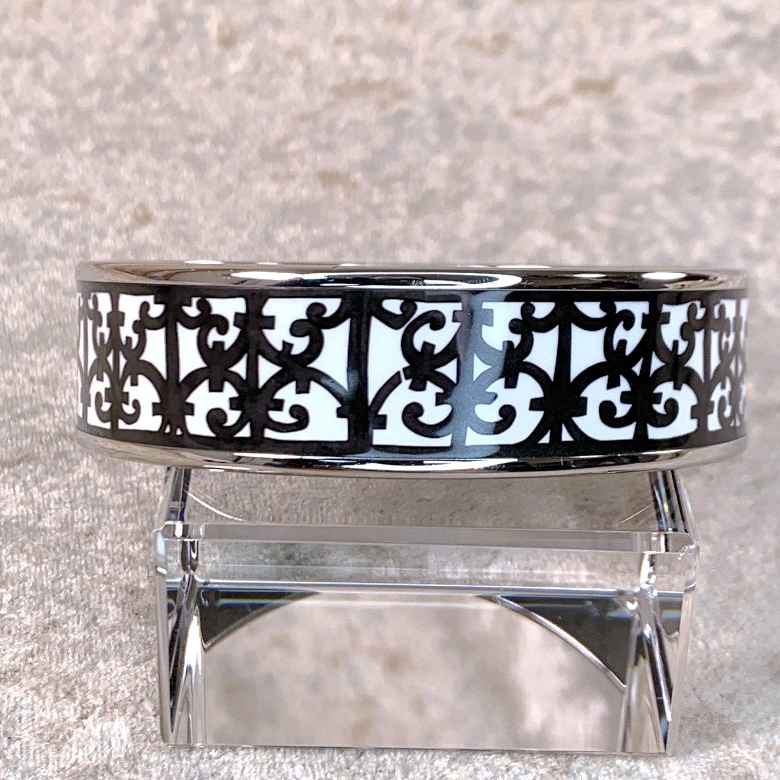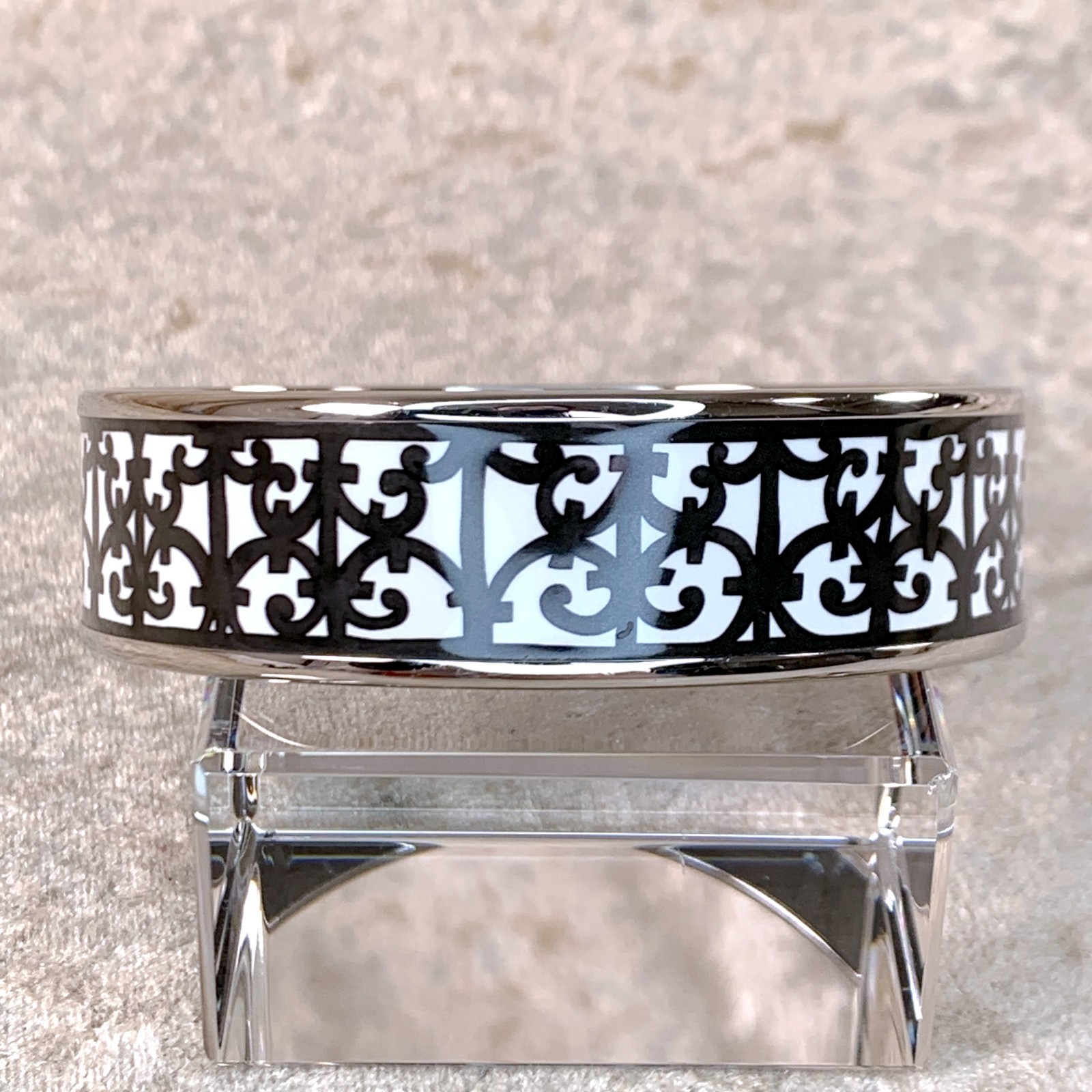 "ITEM DESCRIPTIONS" Authentic Hermes Paris Bangle Bracelet "Balcon du Guadalquivir" Black & White Enamel with Silver Rim Size 70 ITEM CONDITION: Excellent condition with some minor signs of wear visible. * Please examine the photos for details. MATERIAL : Metal / Enamel SIZE : Outside Diameter 7 cm × Circumference about 22 cm, Height 1.9 cm COLOUR : Black / Silver / White MADE IN : Austria ATTACHMENT(S) : Box *Its authenticity is 100% guaranteed. We welcome any questions/comments you may have. * We also have many other unique items in our store. Please check them out. Thank you! "ABOUT US" Thank you for visiting our store! Our products are all 100% genuine brand items guaranteed and shipped from Japan. We pack items with great care and provide our exceptional customer service. If you have any questions, please feel free to contact us anytime! "SHIPPING" The item will be shipped with FedEx or DHL Express shipping depending on your location. The delivery will be safe and fast with full tracking system. Please be confident with your purchase! * If you buy multiple items, we can reduce our shipping fee. Please contact us before your payment in that case. Please let us know if you have any other questions. "PLEASE NOTE" * Payment within 3 days upon purchase is required. * We have 30 day return policy (the item has to be kept in the original condition with all the attachments, and custom duties are not refundable). * Shipping documents will be marked as Merchandise and include the full purchase price. * Import duties & taxes are NOT included in the item price or shipping cost. These charges are the buyer's responsibility (Each country has different regulations. Please check with your country's custom for details ).