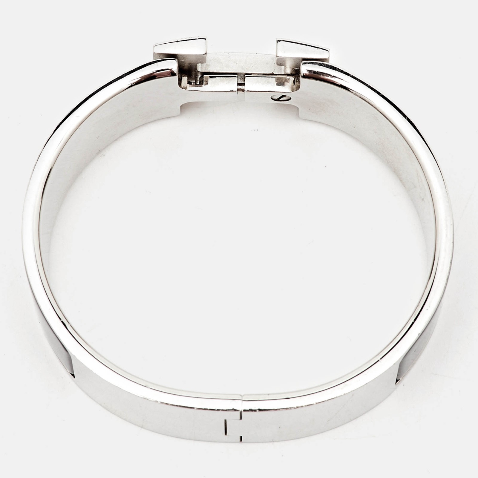 An icon in every fashion circle, the Hermès Clic Clac H bracelet pairs sleek black enamel with polished palladium plating. The hinged design and H shaped clasp make it instantly recognizable—perfect for stacking or wearing alone as a signature statement.Certified by The Luxury Closet - This item has gone through a detailed authentication process overseen by our experts. We offer a lifetime guarantee of authenticity on all our items. Import duties, taxes and charges are not included in the item price. These charges are the buyers responsibility. Please check with your country’s customs office to determine what these additional cost will be prior to buying. Our eBay Store About Us Contact Us Add to Favorite Sellers Hermes Clic Clac H Black Enamel Palladium Plated Bracelet $336.6 An icon in every fashion circle, the Hermès Clic Clac H bracelet pairs sleek black enamel with polished palladium plating. The hinged design and H shaped clasp make it instantly recognizable—perfect for stacking or wearing alone as a signature statement. Product Details Brand Color Black Dimensions Material Enamel Size Outsole Width Outsole Length Heel Height Includes Certified by The Luxury Closet This item has gone through a detailed authentication process overseen by our experts. We offer a lifetime guarantee of authenticity on all our items. How We Check The in-house team of experts at The Luxury Closet is highly trained to verify the authenticity and the condition of the luxury products. They ensure that only 100% authentic items are put on sale.The evaluation process is unique with its own mix of assessment criteria and differs according to the category. Each item is evaluated based on the following combination of hallmarks, hardware, stitching, symmetry, material, craftsmanship, stamping, codes, hologram stickers, and packaging. Our authenticators also check if the items have been modified or amended (e.g., aftermarket diamonds, replaced batteries, repaired bags, etc.) International Buyers Import duties, taxes and charges are not included in the item price. These charges are the buyers responsibility. Please check with your country’s customs office to determine what these additional cost will be prior to buying.