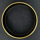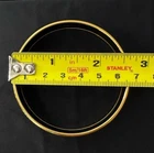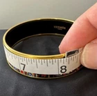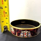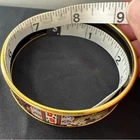 Beautiful Hermes wide bangle in "Coin Purse" printed enamel with gold-plated hardware. Limited edition collectors item! It has never been worn, other than to try on, and is in excellent condition. Made in France. This item, in its particular pattern and color, has been discontinued and it would be difficult to source elsewhere. I am selling this for my mom and I did some basic measurements on her to see who this would fit. My best estimate is that this is a Hermes size 65 (medium). It fits very snugly past my mom’s 8 inch circumference hand and dangles relatively loosely on her 6.25 inch wrist. I’d say there’s about a quarter to a half-inch of space between her wrist and the inner diameter of the bracelet when she has it on. Please see photos for sizing guides and photo measurements.