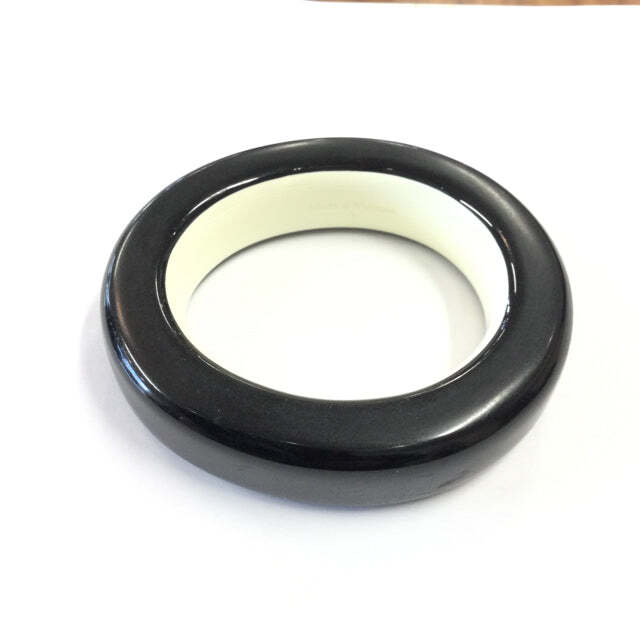 Hermes Resin Black Bangle Bracelet. Black Exterior & Creme Interior Design. Marked on Interior of Bangle. Brand = Hermes Brand = Hermes Color = Black Material = Resin Color = Black Item Number: 29027-4 Item ID: 421082 Category: Jewelry