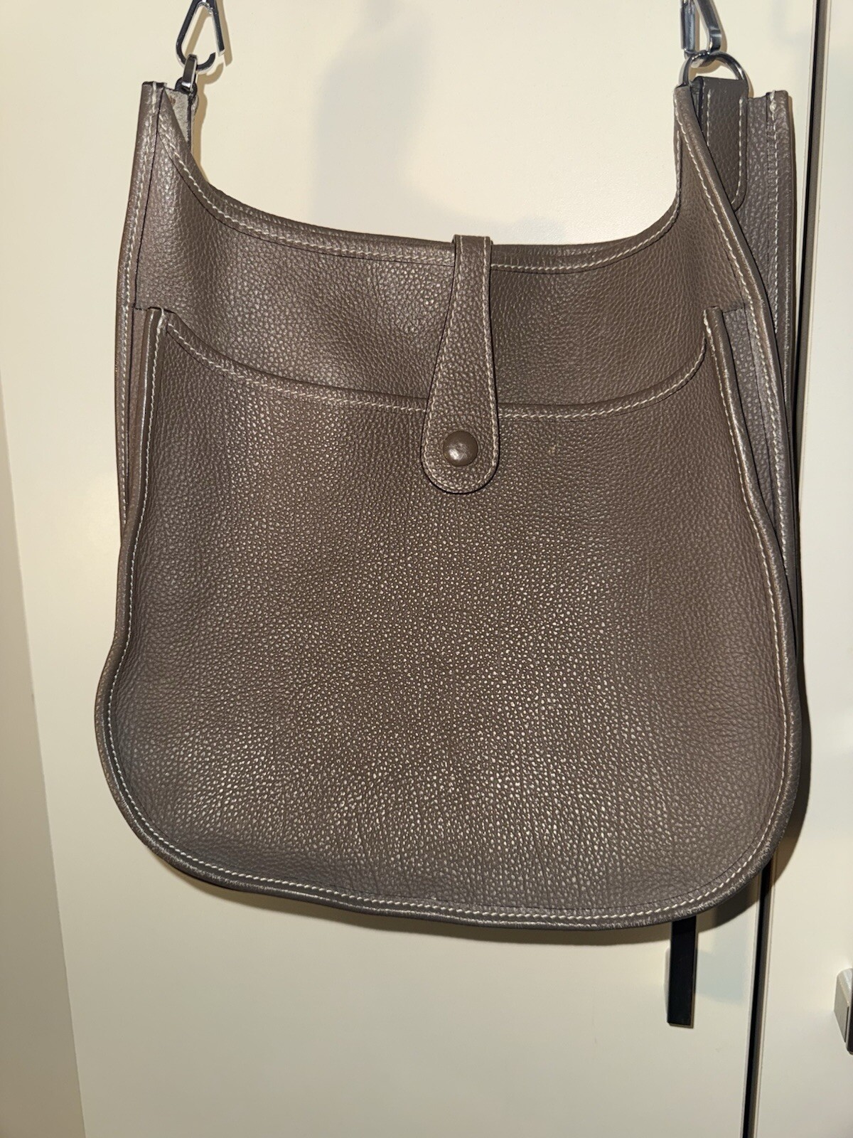 This Hermes Evelyne in taupe with gold hardware is a stunning pre-loved find! The leather is buttery soft, and the crossbody design makes it both chic and practical. The gold hardware adds a luxe touch, and it arrived quickly with secure packaging. A perfect everyday bag with that timeless Hermes elegance—totally worth it!
