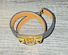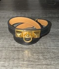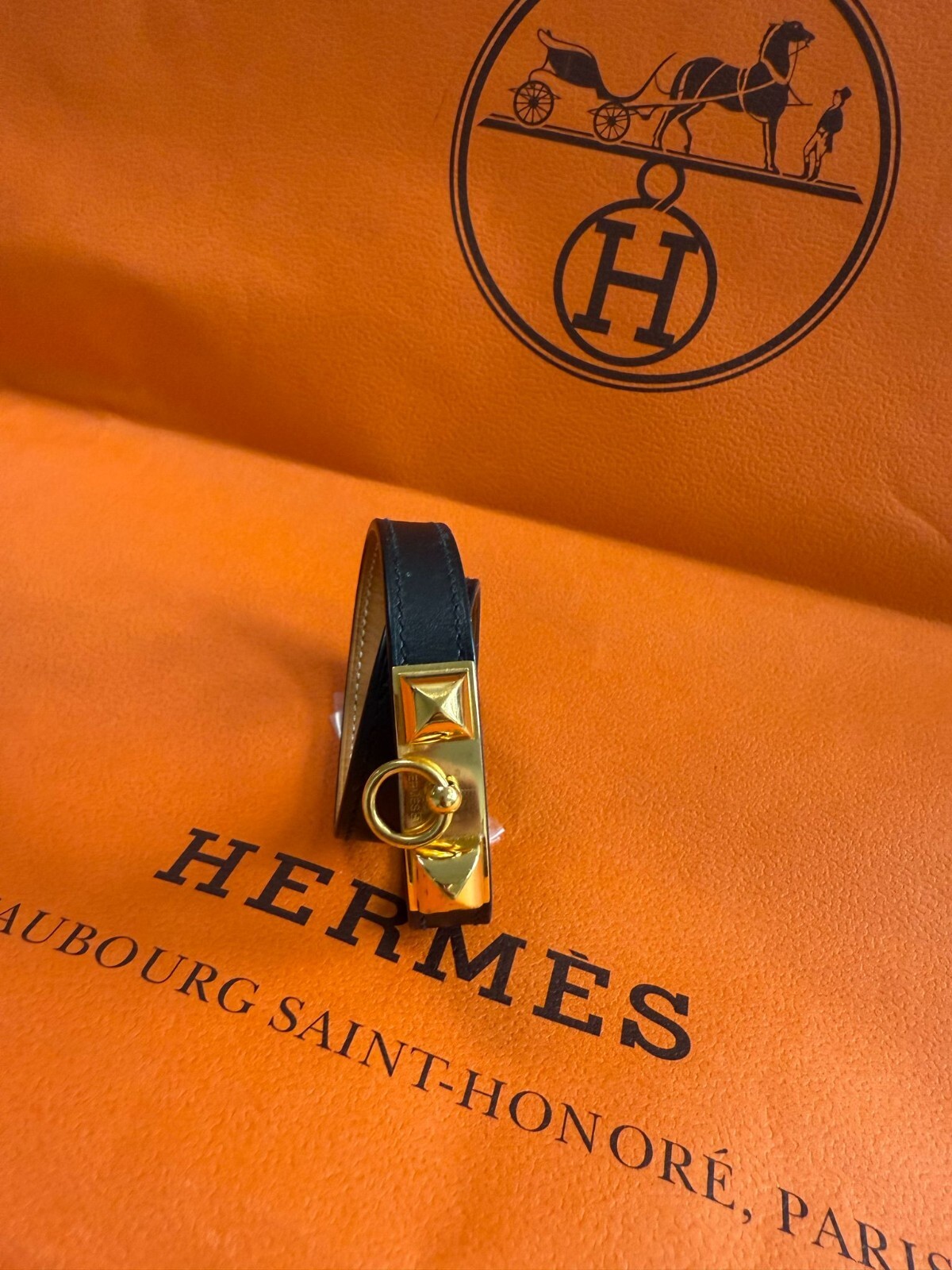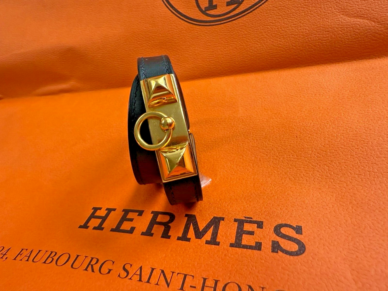 The Hermes Bangle Bracelet Rival Double Tour in black and gold is a luxurious fashion accessory crafted in France. Made from leather with yellow gold plated accents, this bangle bracelet exudes elegance and sophistication. Perfect for adding a touch of French chic to any outfit, this Hermes piece is a versatile and stylish addition to any jewelry collection.
