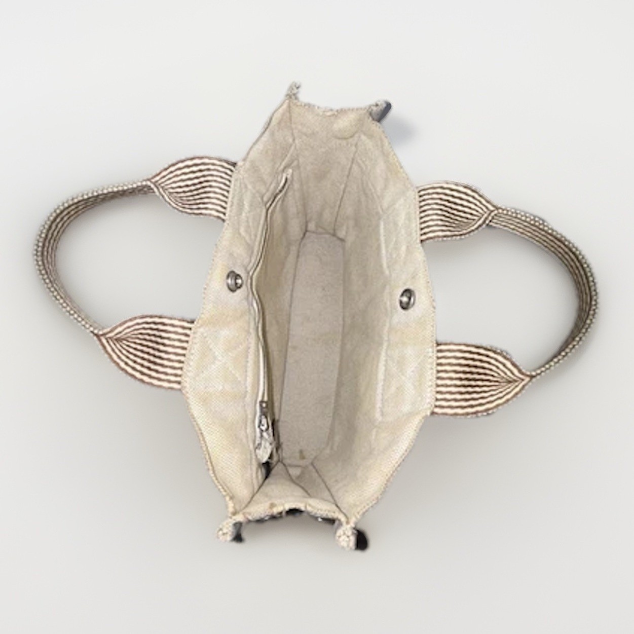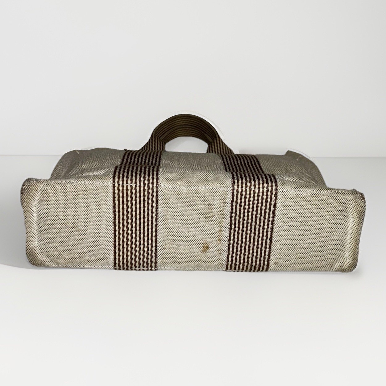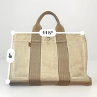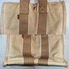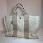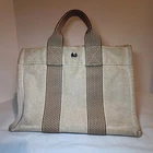 MADE IN FRANCE Hermes PM Tote 100%cotton,used Made in France. Used ,look photos more more details Exterior corner wear. Metal details has a lot scratches, Yellow all over exterior front and back Interior dirty spots in the material. Pre owned. Condition of interior and exterior: There are stains.-Exterior: There is wear on the bottom. • Hermès Top Handle Bag • Neutrals Toile H Canvas • Striped • Palladium-Plated Hardware • Flat Handles • Toile H Canvas & Single Interior Pocket • Snap Closures at Front & Side Handle Drop: 3.5" Height: 8" Width: 11.75" Depth: 3" Hardware: Palladium-Plated Gender: Women Color: Neutrals