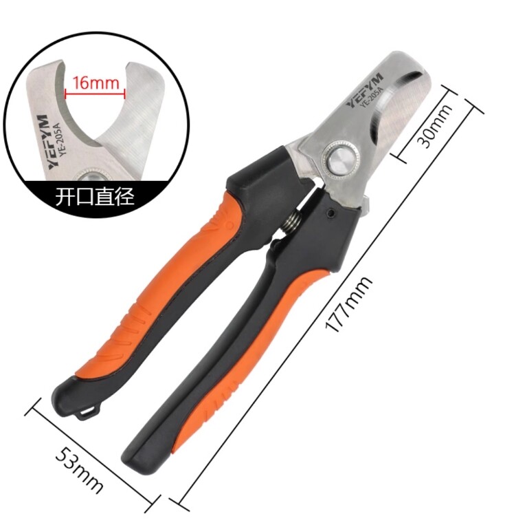 Cable Scissors YE-205A High Carbon Steel Wire Pliers Electrical Cutting Pliers Cable Scissors High Carbon Steel Wire Cutting Pliers Electrical Wire Cutting Scissors Model :YE-205 Cutting range :Φ10mm/16mm² Length :170mm Weight :0.13kg Material :5CR13 stainless steel blade/PP+TPR handle Scope of application: household, electrician maintenance, interior decoration, site, construction, building, etc. Model :YE-205A Wire cutting range :Φ16mm35mm² Length :016mm/35mm2 Weight :0.14kg Material :5CR13 stainless steel cutter/PP+TPR handle Scope of application :Household, electrician maintenance, interior decoration, site, construction, building, etc. Model :HS-125 Wire cutting range :125mm² Length :390mm Weight :0.73kg