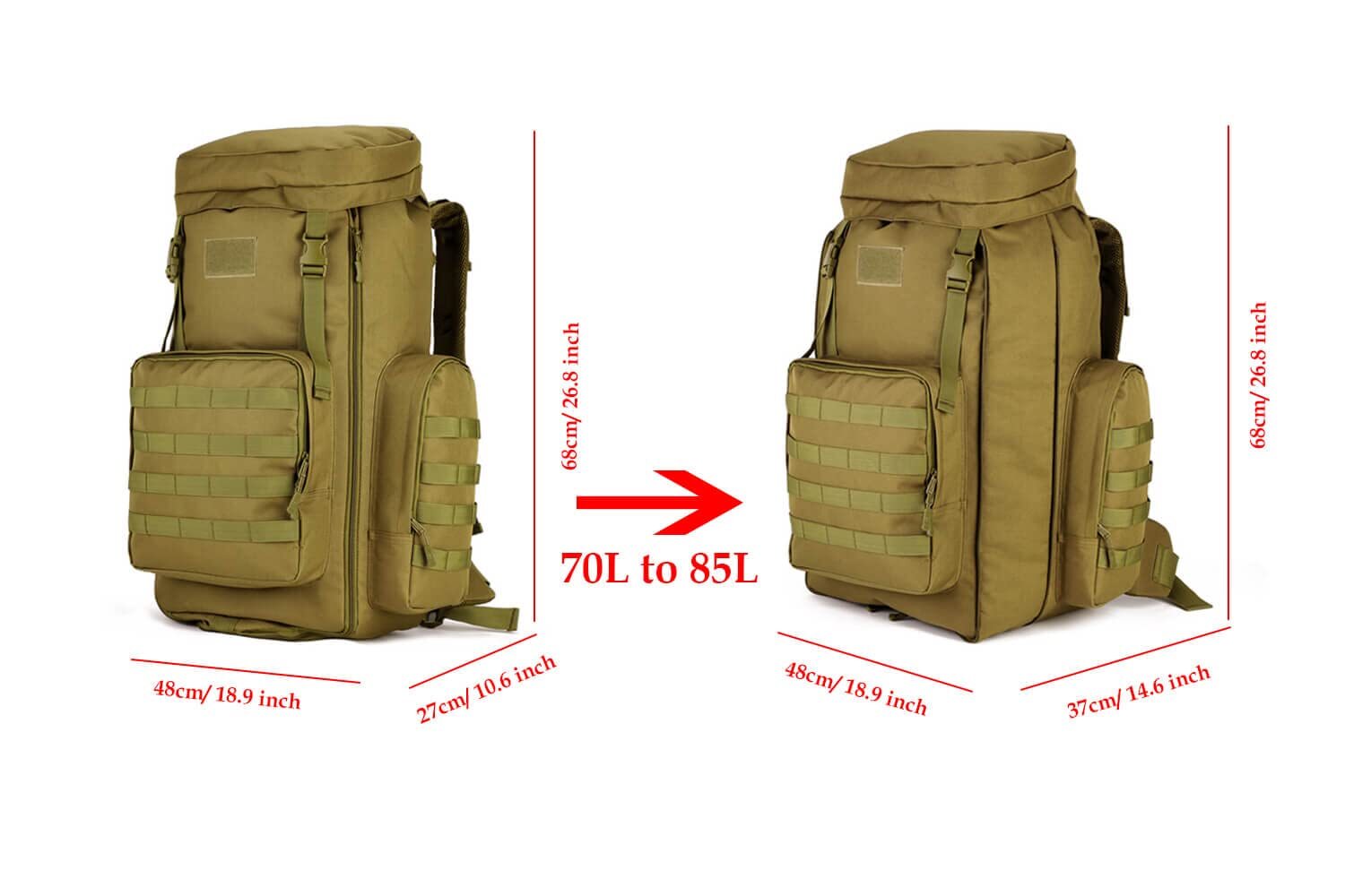 Material: High strength durable water resistant nylon fabric, abrasion-resistant and scratch-resistant, won't fade after long time use. Dimension: 18.9 L x 14.6 W x 26.8 H inch (48cm x 37cm x 68cm), weight: 2.0KG. Capacity: 70L-85L MAX. Large Capacity, it can hold 17 inch laptop, iPad, A4 books, water bottle and about 50-60pcs T-Shirts. Adjustable Straps length, it can be max 100cm. Waistband can adjust to 140cm max. Thick padded comfortable double shoulder strap, lined with mesh breathable material, play a good shoulder protection, more comfortable. MOLLE external expansion system designed to be used in combination with other equipment; you can load pouches, kettle bag, accessory kits and other. Function: Perfect for outdoors, hunting, hiking, camping, fishing, travelling, mountaineering, cycling, trekking and other outdoor activities.