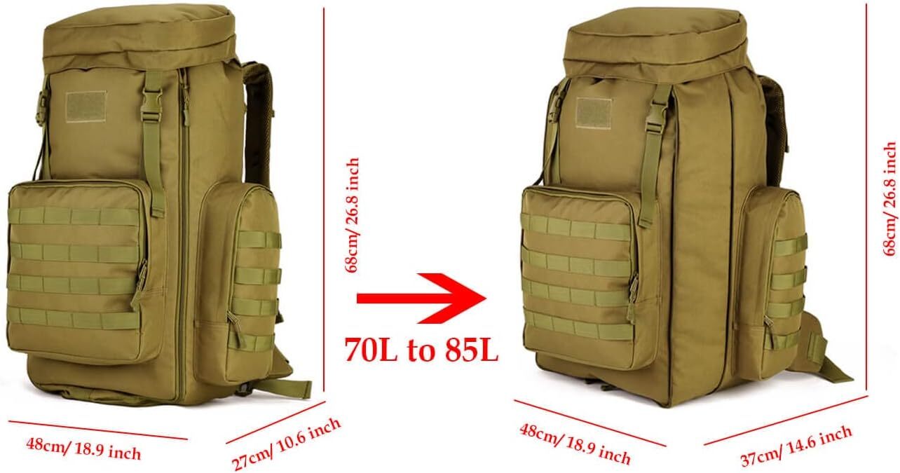 Hiking Backpack 70L Large 85L Tactical MOLLE Military Trekking Black Product Details Material: High strength durable water resistant nylon fabric, abrasion-resistant and scratch-resistant, won't fade after long time use. Dimension: 18.9 L x 14.6 W x 26.8 H inch (48cm x 37cm x 68cm), weight: 2.0KG. Capacity: 70L-85L MAX. Large Capacity, it can hold 17 inch laptop, iPad, A4 books, water bottle and about 50-60pcs T-Shirts. Adjustable Straps length, it can be max 100cm. Waistband can adjust to 140cm max. Thick padded comfortable double shoulder strap, lined with mesh breathable material, play a good shoulder protection, more comfortable. MOLLE external expansion system designed to be used in combination with other equipment; you can load pouches, kettle bag, accessory kits and other. Function: Perfect for outdoors, hunting, hiking, camping, fishing, travelling, mountaineering, cycling, trekking and other outdoor activities.