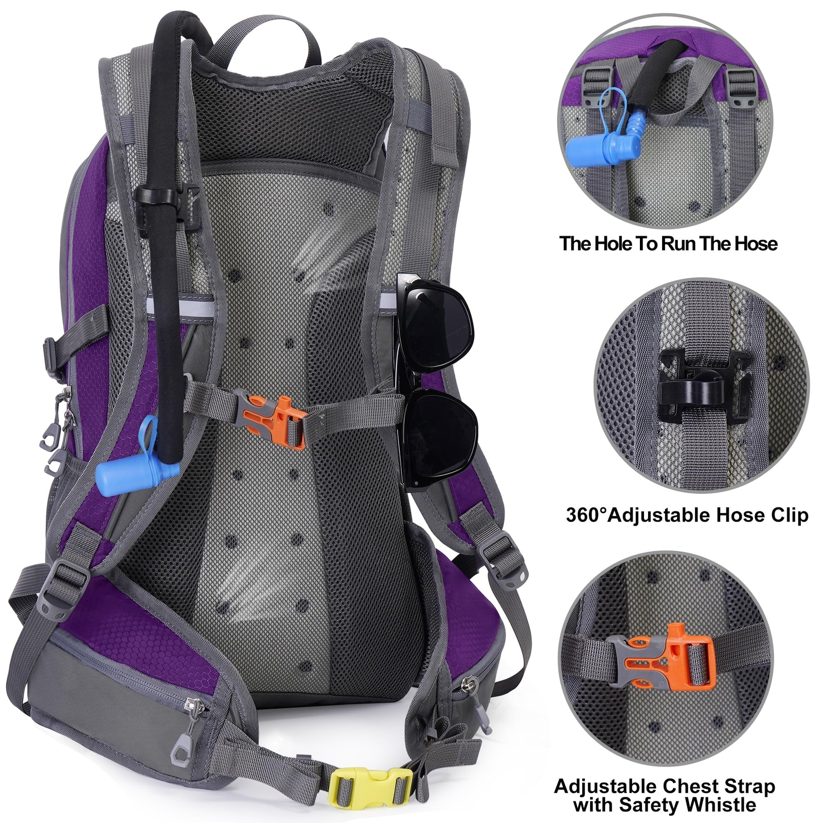 Hiking Backpack with 2L Water Bladder, Hiking Water Backpack with Rain Cover, Insulated Hydration Backpack for Cycling Product Details Color: Purple Brand: SEMSTY MPN: 9115 UPC: Does not apply EAN: Does not apply Brand: SEMSTY Color: Purple Material: Nylon Sport: Snowshoeing Item Weight: 1.4 Pounds Product Dimensions: 11.4"W x 18.2"H Strap Type: Adjustable Capacity: 2 Liters Pocket Description: Utility Pocket Number Of Pockets: 2 Tank Volume: 2 Liters Manufacturer: SEMSTY Item Package Dimensions L x W x H: 10.47 x 9.88 x 4.53 inches Package Weight: 0.8 Kilograms Brand Name: SEMSTY Country of Origin: China Warranty Description: water backpack for hiking Model Name: 20l hydration backpack Suggested Users: unisex Number of Items: 1 Part Number: 9115 Included Components: hiking backpack with water bladder Date First Available: September 18, 2022 Utmost Storage Capacity: Semsty hydration backpack size is L 11.4'' * W 5.5'' * H 18.2''. Overall capacity is 20 L hiking backpack, 2 L water bladder, a separate insulated pack. Main compartment to fit water bladder, clothes, notebook. Middle compartment for daily or hiking essentials. Built-in front mesh pocket for towel. Extra water bottle in the side mesh pockets for easy access. Helmet carry in the front helmet clip.Two convenient waist strap pockets for phone,keys or other small items Hands Free Drinking: This water backpack for hiking comes with 2 Liter hydration bladder & bilateral hose outlets designed to free your hands. High-flow bite valve; Large 5.9" (15cm) opening, easy to put in ice or wash and dry. The 2 Liter bladder is replaceable and supports up to 3 Liter Separate insulated compartment: Semsty hydration backpack pack with 2 l hydration bladder also come with a separate insulated bladder compartment for 6 Hours' Cooling(with ice packs) and prevents the water bladder from sweating out. Remove the water bladder and the insulated pack, it is a normal daypack, suitable for hiking, commuting, travel,cycling, skiing, etc. Do not hesitate to achieve a 20 l hiking backpack with water bladder for multiple uses Lightweight & Comfortable: Weighing just 1.4 LB (0.63kg), this hydration pack backpack is feather-light, streamlined. With Ultra-Elastic 3D breathable padded back & adjustable chest, waist straps , this lightweight small hiking backpack for women adjusts to fit all frames comfortably. Perfect fits all sizes Details For Your Safe: This 2 Liter backpack water bladder is 100% BPA free &anti-leak guaranteed. High-Density Nylon fabric and Built-in Rain Cover, ideal for any rainy activities. Reflective strips keep you visible in low-light conditions. The water clip buckle on the shoulder strap can be placed on the left or right side If you have any problems, please reach out to us, we will reply within 24hrs. (We provide replacement services for quality problems within 1 year and lifetime customer service)