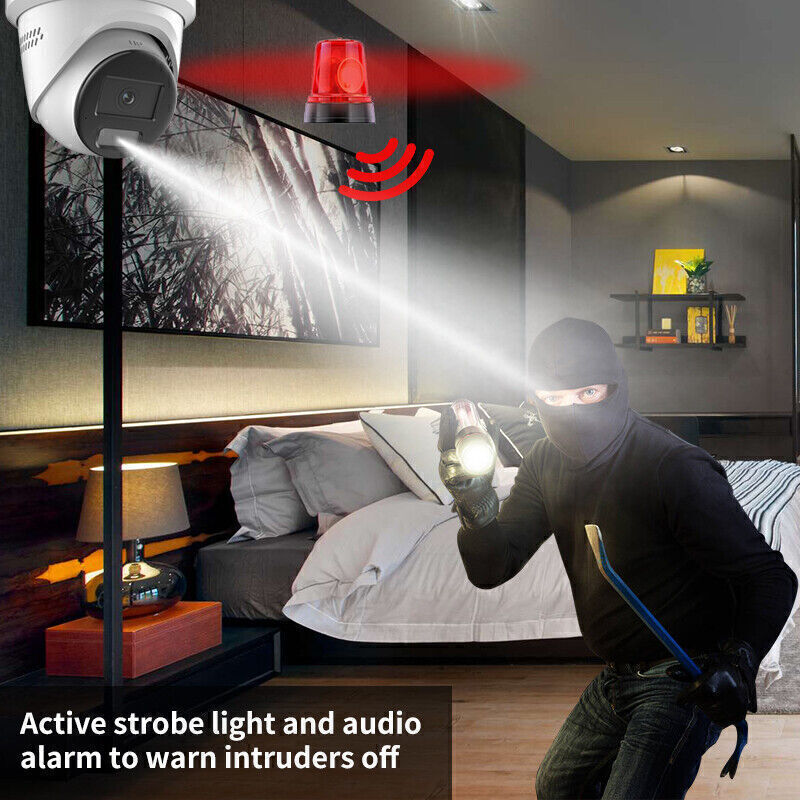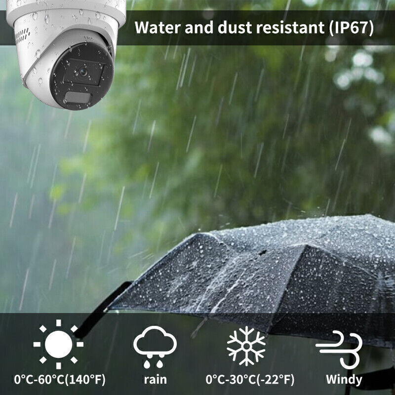 8 MP Smart Hybrid Light with ColorVu Fixed Turret Network Camera High quality imaging with 8 MP resolution Smart Hybrid Light: advanced technology with long range Clear imaging against strong back light due to 130 dB WDR technology Efficient H.265+ compression technology Focus on human and vehicle classification based on deep learning Provide real-time security via built-in two-way audio Active strobe light and audio alarm to warn intruders off Support on-board storage up to 512 GB (SD card slot) Water and dust resistant (IP67) Audio and alarm interface available Note:Manual Upgrade Only- If you need to upgrade the camera firmware, please contact with us for Manual Upgrade Guide,thannks. Camera Image Sensor 1/1.8" Progressive Scan CMOS Max. Resolution 3840 × 2160 Min. Illumination Color: 0.0008 Lux @ (F1.0, AGC ON),0 Lux with light Shutter Time 1/3 s to 1/100,000 s Day & Night IR cut filter Angle Adjustment Pan: 0° to 360°,tilt: 0° to 75°,rotate: 0° to 360° Lens Lens Type Fixed focal lens, 2.8 and 4 mm optional Focal Length & FOV 2.8 mm, horizontal FOV 108.8°, vertical FOV 56.4°, diagonal FOV 134.3° 4 mm, horizontal FOV 93.3°, vertical FOV 47.2°, diagonal FOV 114.2° Lens Mount M16 Iris Type Fixed Aperture F1.0 Depth Of Field 2.8 mm: 3.3 m to ∞ 4 mm: 3.8 m to ∞ DORI DORI 2.8 mm: D: 89 m, O: 35 m, R: 17 m, I: 8 m 4 mm: D: 109 m, O: 43 m, R: 21 m, I: 10 m Illuminator Supplement Light Type IR,White Light Supplement Light Range Up to 30 m Smart Supplement Light Yes IR Wavelength 850 nm Video Main Stream 50 Hz: 25 fps (3840 × 2160, 3200 × 1800, 2688 × 1520, 1920 × 1080, 1280 × 720) 60 Hz: 24 fps (3840 × 2160) 30 fps (3200 × 1800, 2688 × 1520, 1920 × 1080, 1280 × 720) Sub-Stream 50 Hz: 25 fps (1280 × 720, 640 × 480, 640 × 360) 60 Hz: 30 fps (1280 × 720, 640 × 480, 640 × 360) Third Stream 50 Hz: 10 fps (1920 × 1080, 1280 × 720, 640 × 480, 640 × 360) 60 Hz: 10 fps (1920 × 1080, 1280 × 720, 640 × 480, 640 × 360) *Third stream is supported under certain settings. Video Compression Main stream: H.265/H.264/H.264+/H.265+, Sub-stream: H.265/H.264/MJPEG, Third stream: H.265/H.264, *Third stream is supported under certain settings. Video Bit Rate 32 Kbps to 16 Mbps H.264 Type Baseline Profile,Main Profile,High Profile H.265 Type Main Profile Bit Rate Control CBR,VBR Scalable Video Coding (SVC) H.264 and H.265 encoding Region Of Interest (ROI) 1 fixed region for main stream and sub-stream Audio Audio Compression G.711/G.722.1/G.726/MP2L2/PCM/MP3/AAC-LC Audio Type Mono sound Audio Bit Rate 64 Kbps (G.711ulaw/G.711alaw)/16 Kbps (G.722.1)/16 Kbps (G.726)/32 to 192 Kbps (MP2L2)/8 to 320 Kbps (MP3)/16 to 64 Kbps (AAC-LC) Audio Sampling Rate 8 kHz/16 kHz/32 kHz/44.1 kHz/48 kHz Environment Noise Filtering Yes Network Protocols TCP/IP, ICMP, HTTP, HTTPS, FTP, DHCP, DNS, DDNS, RTP, RTSP, RTCP, NTP, UPnP, SMTP, IGMP, 802.1X, QoS, IPv4, IPv6, UDP, Bonjour, SSL/TLS, PPPoE, SNMP, WebSocket, WebSockets, SRTP, SFTP Simultaneous Live View Up to 6 channels API Open Network Video Interface (Profile S, Profile G, Profile T),ISAPI,SDK,ISUP User/Host Up to 32 users 3 user levels: administrator, operator, and user Security Password protection, complicated password, HTTPS encryption, 802.1X authentication (EAP-TLS, EAP-LEAP, EAP-MD5), watermark, IP address filter, basic and digest authentication for HTTP/HTTPS, WSSE and digest authentication for Open Network Video Interface, RTP/RTSP over HTTPS, control timeout settings, security audit log, TLS 1.1/1.2/1.3, host authentication (MAC address) Network Storage NAS (NFS, SMB/CIFS),Auto Network Replenishment (ANR) Client iVMS-4200,Hik-Connect Web Browser Plug-in required live view: IE 10, IE 11, Plug-in free live view: Chrome 57.0+, Firefox 52.0+, Edge 89+, Local service: Chrome 57.0+, Firefox 52.0+, Edge 89+ Image Image Parameters Switch Yes Image Settings Rotate mode,saturation,brightness,contrast,sharpness,gain,white balance,adjustable by client software or web browser Day/Night Switch Day,Night,Auto,Schedule Image Enhancement BLC,HLC,3D DNR,Defog SNR ≥ 52 dB Wide Dynamic Range (WDR) 130 dB Privacy Mask 4 programmable polygon privacy masks Interface Ethernet Interface 1 RJ45 10 M/100 M self-adaptive Ethernet port On-Board Storage Built-in memory card slot, support microSD/microSDHC/microSDXC card, up to 512 GB Built-In Microphone Yes,1 built-in microphone Built-In Speaker Max. power consumption: 1.2 W, max. sound pressure level: 10 cm: 95 dB. Audio 1 input (line in), two-core terminal block, max. input amplitude: 3.3 Vpp, input impedance: 4.7 KΩ, interface type: non-equilibrium, 1 output (line out), two-core terminal block, max. output amplitude: 3.3 Vpp, output impedance: 100 Ω, interface type: non-equilibrium Alarm 1 input, 1 output (max. 24 VDC/24 VAC, 1 A) Reset Key Yes Event Basic Event Motion detection (support alarm triggering by specified target types (human and vehicle)),video tampering alarm,exception Linkage Upload to FTP/NAS/memory card,notify surveillance center,send email,trigger alarm output,trigger recording,trigger capture,audible warning,strobe light Smart Event Scene change detection Deep Learning Function Face Capture Yes Perimeter Protection Line crossing, intrusion, region entrance, region exiting Support alarm triggering by specified target types (human and vehicle) General Power 12 VDC ± 25%, 0.75 A, max. 9 W,Ø5.5 mm coaxial power plug,reverse polarity protection, PoE: IEEE 802.3af, Class 3, max. 10.5 W Material Cover: metal, main body: metal Dimension Ø138.3 mm × 115.4 mm (Ø5.4" × 4.5") Package Dimension 170 mm × 170 mm × 160 mm (6.7" × 6.7" × 6.3") Weight Approx. 820 g (1.8 lb.) With Package Weight Approx. 1316 g (2.9 lb.) Storage Conditions -30 °C to 60 °C (-22 °F to 140 °F). Humidity 95% or less (non-condensing) Startup And Operating Conditions -30 °C to 60 °C (-22 °F to 140 °F). Humidity 95% or less (non-condensing) General Function Heartbeat,mirror,flash log,password reset via email,pixel