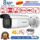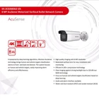 Product Description 8 MP AcuSense Motorized Varifocal Bullet Network Camera DS-2CD2683G2-IZS (2.8-12mm) Features: High quality imaging with 8 MP resolution Motorized varifocal lens for easy installation and monitoring Efficient H.265+ compression technology Clear imaging against strong backlight due to 120 dB true WDR technology Focus on human and vehicle targets classification based on deep learning Audio and alarm interface available Water and dust resistant (IP67) and vandal-resistant (IK10) Specifications: Camera Image Sensor 1/2.8" Progressive Scan CMOS Max. Resolution 3840 × 2160 Min. Illumination Color: 0.005 Lux @ (F1.6, AGC ON),B/W: 0 Lux with IR Shutter Time 1/3 s to 1/100,000 s Day & Night IR cut filter Angle Adjustment Pan: 0° to 355°,tilt: 0° to 90°,rotate: 0° to 360° Lens Lens Type Varifocal lens, motorized lens, 2.8 to 12 mm Focal Length & FOV 2.8 to 12 mm, horizontal FOV 108° to 30°, vertical FOV 56° to 17°, diagonal FOV 131° to 35° Lens Mount Ø14 Iris Type Fixed Aperture F1.6 DORI DORI 2.8 to 12 mm: D: 97 m to 290 m, O: 38 m to 115 m, R: 19 m to 58 m, I: 9 m to 29 m Illuminator Supplement Light Type IR Supplement Light Range Up to 60 m Smart Supplement Light Yes IR Wavelength 850 nm Video Main Stream 50 Hz: 20 fps (3840 × 2160) 25 fps (3200 × 1800, 2688 × 1520, 1920 × 1080, 1280 × 720) 60 Hz: 20 fps (3840 × 2160) 30 fps (3200 × 1800, 2688 × 1520, 1920 × 1080, 1280 × 720) Sub-Stream 50 Hz: 25 fps (1280 × 720, 640 × 480, 640 × 360) 60 Hz: 30 fps (1280 × 720, 640 × 480, 640 × 360) Third Stream 50 Hz: 10 fps (1920 × 1080, 1280 × 720, 640 × 480, 640 × 360) 60 Hz: 10 fps (1920 × 1080, 1280 × 720, 640 × 480, 640 × 360) Video Bit Rate 32 Kbps to 16 Mbps H.264 Type Baseline Profile,Main Profile,High Profile H.265 Type Main Profile Bit Rate Control CBR,VBR Scalable Video Coding (SVC) H.264 and H.265 encoding Video Compression Main stream: H.265+/H.265/H.264+/H.264, Sub-stream: H.265/H.264/MJPEG, Third stream: H.265/H.264 Region Of Interest (ROI) 1 fixed region(s) for main stream and sub-stream Audio Audio Type Mono sound Audio Compression G.711/G.722.1/G.726/MP2L2/PCM/MP3/AAC-LC Audio Bit Rate 64 Kbps (G.711 ulaw)/64 Kbps (G.711 alaw)/16 Kbps (G.722.1)/16 Kbps (G.726)/32 to 192 Kbps (MP2L2)/8 to 320 Kbps (MP3)/16 to 64 Kbps (AAC-LC) Audio Sampling Rate 8 kHz/16 kHz/32 kHz/44.1 kHz/48 kHz Environment Noise Filtering Yes Network Protocols TCP/IP, ICMP, HTTP, HTTPS, FTP, DHCP, DNS, DDNS, RTP, RTSP, NTP, UPnP, SMTP, IGMP, 802.1X, QoS, IPv4, IPv6, UDP, Bonjour, SSL/TLS, PPPoE, SNMP, ARP, WebSocket, WebSockets Simultaneous Live View Up to 6 channels API Open Network Video Interface (Profile S, Profile G, Profile T),ISAPI,SDK User/Host Up to 32 users 3 user levels: administrator, operator, and user Security Password protection, complicated password, HTTPS encryption, IP address filter, Security Audit Log, basic and digest authentication for HTTP/HTTPS, TLS 1.1/1.2, WSSE and digest authentication for Open Network Video Interface Network Storage NAS (NFS, SMB/CIFS),Auto Network Replenishment (ANR),Together with high-end Hikvision memory card, memory card encryption and health detection are supported. Client iVMS-4200,Hik-Connect,Hik-Central Web Browser Plug-in required live view: IE 10, IE 11, Plug-in free live view: Chrome 57.0+, Firefox 52.0+, Edge 89+, Local service: Chrome 57.0+, Firefox 52.0+, Edge 89+ Image Image Parameters Switch Yes Image Settings Rotate mode,saturation,brightness,contrast,sharpness,gain,white balance,adjustable by client software or web browser Day/Night Switch Day,Night,Auto,Schedule Wide Dynamic Range (WDR) 120 dB SNR ≥ 52 dB Image Enhancement BLC,HLC,3D DNR Privacy Mask 4 programmable polygon privacy masks Interface Ethernet Interface 1 RJ45 10 M/100 M self-adaptive Ethernet port Audio 1 input (line in), two-core terminal block, max. input amplitude: 3.3 Vpp, input impedance: 4.7 KΩ, interface type: non-equilibrium, 1 output (line out), two-core terminal block, max. output amplitude: 3.3 Vpp, output impedance: 100 Ω, interface type: non-equilibrium On-Board Storage Built-in memory card slot, support microSD/microSDHC/microSDXC card, up to 512 GB Alarm 1 input, 1 output (max. 24 VDC, 1 A) Reset Key Yes Event Basic Event Motion detection (support alarm triggering by specified target types (human and vehicle)),video tampering alarm,exception Smart Event Face detection,Line crossing detection, intrusion detection (support alarm triggered by specified target types (human and vehicle)) Linkage Upload to FTP/NAS/memory card,notify surveillance center,send email,trigger recording,trigger capture General Power 12 VDC ± 25%, 1.08 A, max. 13 W,Ø5.5 mm coaxial power plug,reverse polarity protection, PoE: 802.3at, Class 4, 42.5 V to 57 V, 0.36 A to 0.27 A, max. 15 W Dimension 97.9 mm × 93 mm × 308.5 mm (3.9" × 3.7" × 12.1") Material Aluminum alloy body Package Dimension 385 mm × 190 mm × 180 mm (15.2" × 7.5" × 7.1") Weight Approx. 1385 g (3.1 lb.) With Package Weight Approx. 2046 g (4.5 lb.) Storage Conditions -30 °C to 60 °C (-22 °F to 140 °F). Humidity 95% or less (non-condensing) Startup And Operating Conditions -30 °C to 60 °C (-22 °F to 140 °F). Humidity 95% or less (non-condensing) Language 33 languages: English, Russian, Estonian, Bulgarian, Hungarian, Greek, German, Italian, Czech, Slovak, French, Polish, Dutch, Portuguese, Spanish, Romanian, Danish, Swedish, Norwegian, Finnish, Croatian, Slovenian, Serbian, Turkish, Korean, Traditional Chinese, Thai, Vietnamese, Japanese, Latvian, Lithuanian, Portuguese (Brazil), Ukrainian General Function Heartbeat,password reset via email,pixel counter,anti-flicker Approval EMC FCC: 47 CFR Part 15, Subpart B, CE-EMC: EN 55032: 2015, EN 61000-3-2:2019, EN 61000-3-3: 2013+A1:2019, EN 50130-4: 2011 +A1: 2014, RCM: AS/NZS CISPR 32: 2015, KC: KN32: 2015, KN35: 2015, IC: ICES-003: Issue 7 Safety UL: UL 62368-1, CB: IEC 62368-1: 2014+A11, CE-LVD: EN 62368-1: 2014/A11: 2017 Envi