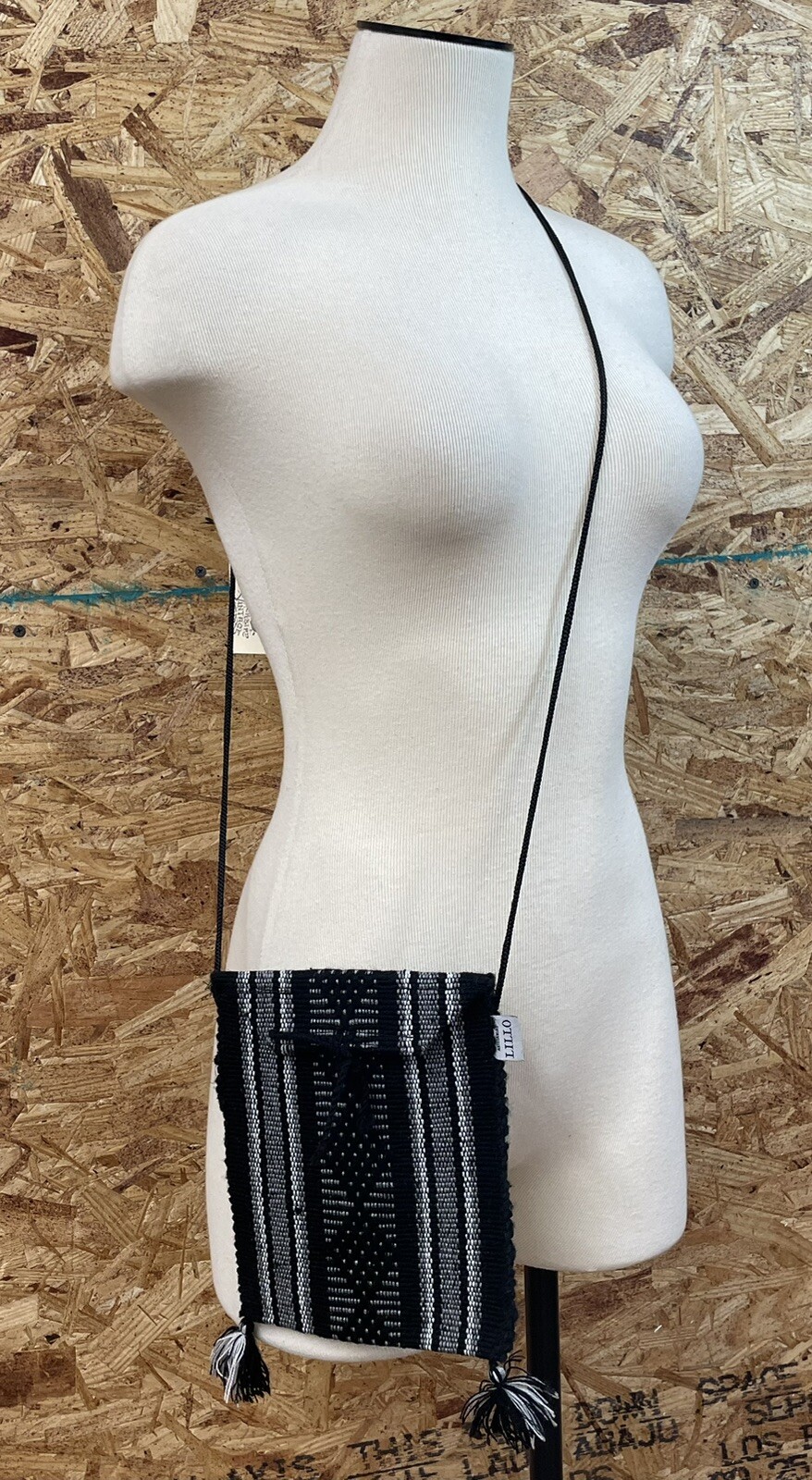 Tasseled woven passport holder crossbody bag. Flat enough to be worn under clothing. Black, white and gray. 90% acrylic 10% polyester. Tie closure. Made in Mexico. Measures 8.25“ x 6.75“. Strap is stretchy and has a 20 inch drop .