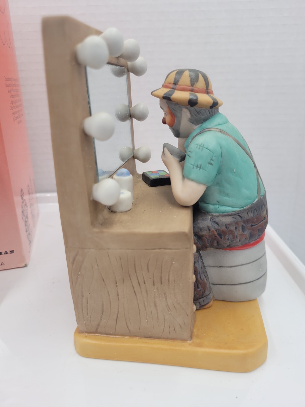 This charming ceramic figurine features Emmett Kelly Jr. putting on makeup and dressing room, measuring 6 inches in length. The piece captures the essence of the classic clown, with intricate details and a whimsical design. Crafted by the renowned artist Emmett Kelly, this figurine is a must-have for any collector of decorative collectibles. The piece is perfect for those who appreciate the artistry of clowns and circuses. Add a touch of nostalgia to your collection with this Emmett Kelly Clown figurine. Elect