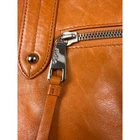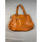 Hobo International tote bag crafted from vibrant orange glazed leather with a soft, slouchy silhouette. This spacious shoulder bag features a top zip closure, silver-tone hardware, and multiple interior organizational pockets including a zippered compartment and slip pockets lined in a decorative floral print fabric. The exterior includes a convenient back zip pocket for quick access to essentials. Note that there is some visible wear and darkening on the bottom corners as shown in the photos.