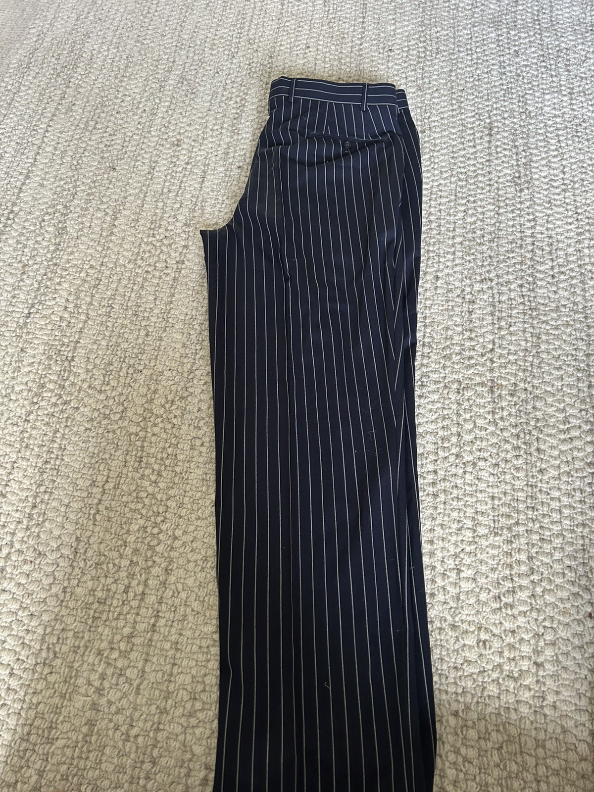 JACKET AND 2 PAIRS OF TROUSERS PLEASE NOTE THIS SUIT HAS VARIOUS SMALL MOTH HOLES IN FROM BEING IN STORAGE WHICH CAN BE REPAIRED BY A TAILOR BUT OTHERWISE PERFECT CONDITION AS ONLY WORN LIGHTLY SPARE SMALL PIECE OF FABRIC INCLUDED FOR REPAIRS JACKET MEASUREMENTS:- PIT TO PIT 24” LENGTH 31.5” SHOULDER TO SHOULDER 19” SHOULDER TO CUFF 27” TROUSER MEASUREMENTS:- WAIST 40” LEG 31.5” This Holland Sherry Saville Row Bespoke Blue Pinstripe Suit is a sophisticated and elegant three-piece option for men in size 46 Regular. The navy blue pinstripe colour and tailored fit make it suitable for various occasions, from formal events to casual outings. The jacket features a four-button sleeve button style, notch lapel, and inner pockets, while the trousers have a straight leg style with a 32" inseam. Made from high-quality Super 100's Worsted Wool with a viscose lining, this British-made suit exudes classic style and attention to detail, perfect for those who appreciate timeless fashion.