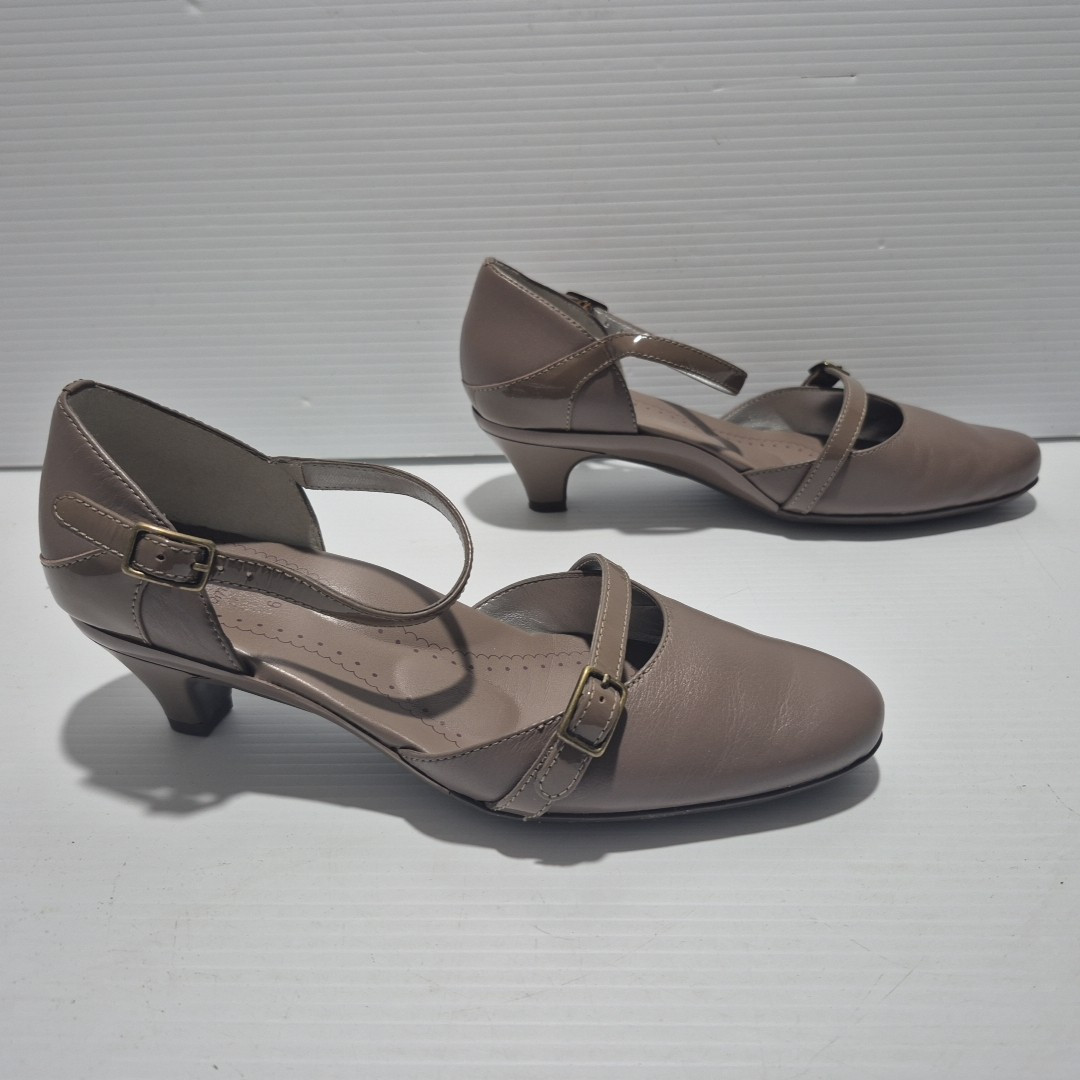 Visit The Rag Traders Closet for hundreds of other quality men's & women's garments! ......IMPORTANT INFORMATION FOR BUYERS...... Garment sizes can vary between brands, eras, and due to wear and washing over time. Teen garments may also have similar sizing to small adult pieces and are not always easily distinguishable. To ensure the best fit, buyers are encouraged to check all provided measurements, review photos, and read the full description before purchasing, as it is the purchaser's responsibility to do so. Description: The Homyped Yvonne heels offer both comfort and style with a classic closed-toe design and a secure ankle strap with buckle closure. Featuring a 5cm heel, these shoes provide subtle elevation while maintaining stability. The brown upper and sole are possibly synthetic. A versatile addition to any wardrobe, suitable for both casual and formal occasions. Key Features: Brand: Homyped Style Name: Yvonne (#101774) Size: 6 Material: Possibly synthetic upper and sole Color: Brown Design: Closed toe, ankle strap with buckle closure Heel Height: 5 cm Measurements (approx.): Sole length (toe to back of heel): 25 cm Condition: Excellent, near-new condition with minimal signs of wear. Please refer to photos as they form part of the description Sent with Australia Post standard parcels Visit our store to view hundreds of other items combined postage available