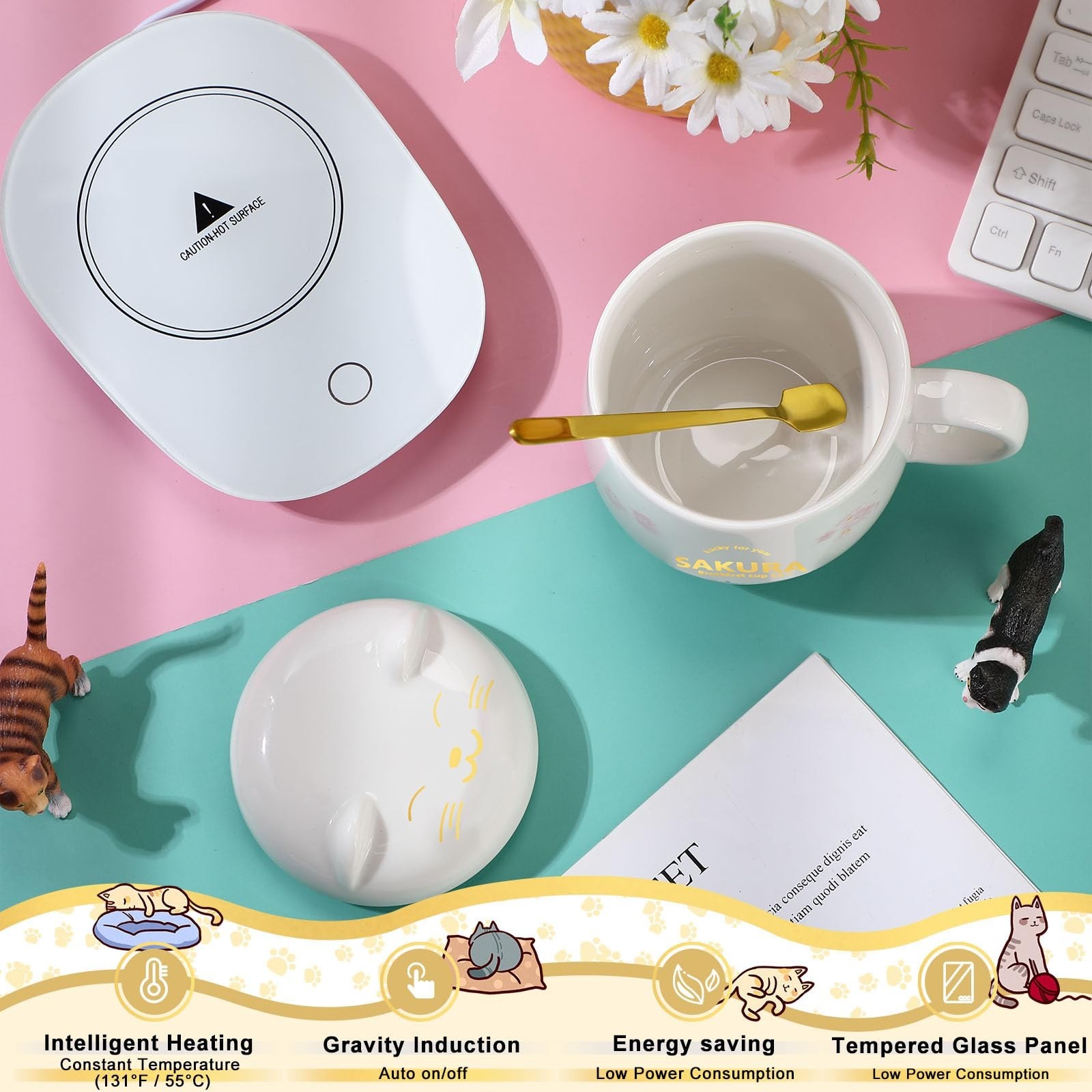 This coffee warmer is a game-changer! Keeps my coffee perfectly hot all morning without burning it. The cute cat design adds a fun touch to my desk, and the ceramic mug feels sturdy. Super easy to use—just plug in and enjoy warm coffee for hours. Great gift idea for coffee lovers!