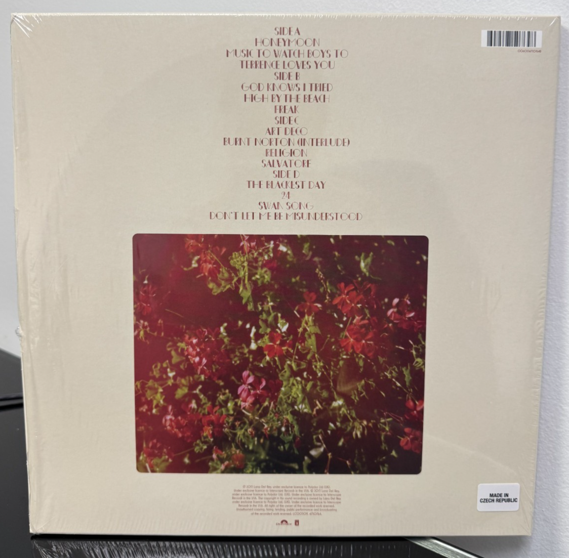 Honeymoon by Lana del Rey (LIMITED EDITION RED VINYL 2LP!) *SEALED*VERY RARE!!* Online exclusive with an alternate gatefold sleeve design. Printed inner sleeves and a 16-page 12"x12" booklet insert. Includes download code for a digital copy of the album in CD quality wav format from thesoundofvinyl.com. Quote from official Universal Music's Lana Del Rey online store: "The brand new album from Lana Del Rey, Honeymoon is available here on red double heavyweight, gatefold vinyl complete with a 16 page booklet, and a UK online exclusive alternative cover art." Side C tracks segue into each other with no discernible break.