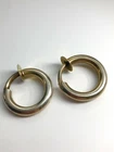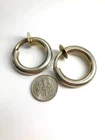 Modern style, vintage 925 hoop earrings. 1 1/8" Diam, 3/16" thickness, spring slide fastener, pre-owned, very good condition, signed but hallmark unknown + 925. One earring slide may 'catch', a slight press on the top of the slide will release it.