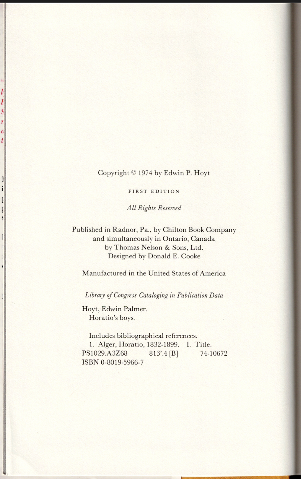 Horatio's Boys - The Life and Works of Horatio Alger Jr. ; by Edwin Hoyt - HC Horatio's Boys - The Life and Works of Horatio Alger Jr. ; by Edwin Hoyt - HC This copy is a first edition in VERY GOOD+ used condition overall. The dust-jacket has light wear, it is now covered in clear, removable, protective film The boards have minimal wear. The binding is in excellent order. The pages are clean, they DO NOT have any names, inscriptions or marking of text. Click here to visit PATRICK ANDREAS QUALITY BOOKS Store Home Page . Listing and template services provided by inkFrog
