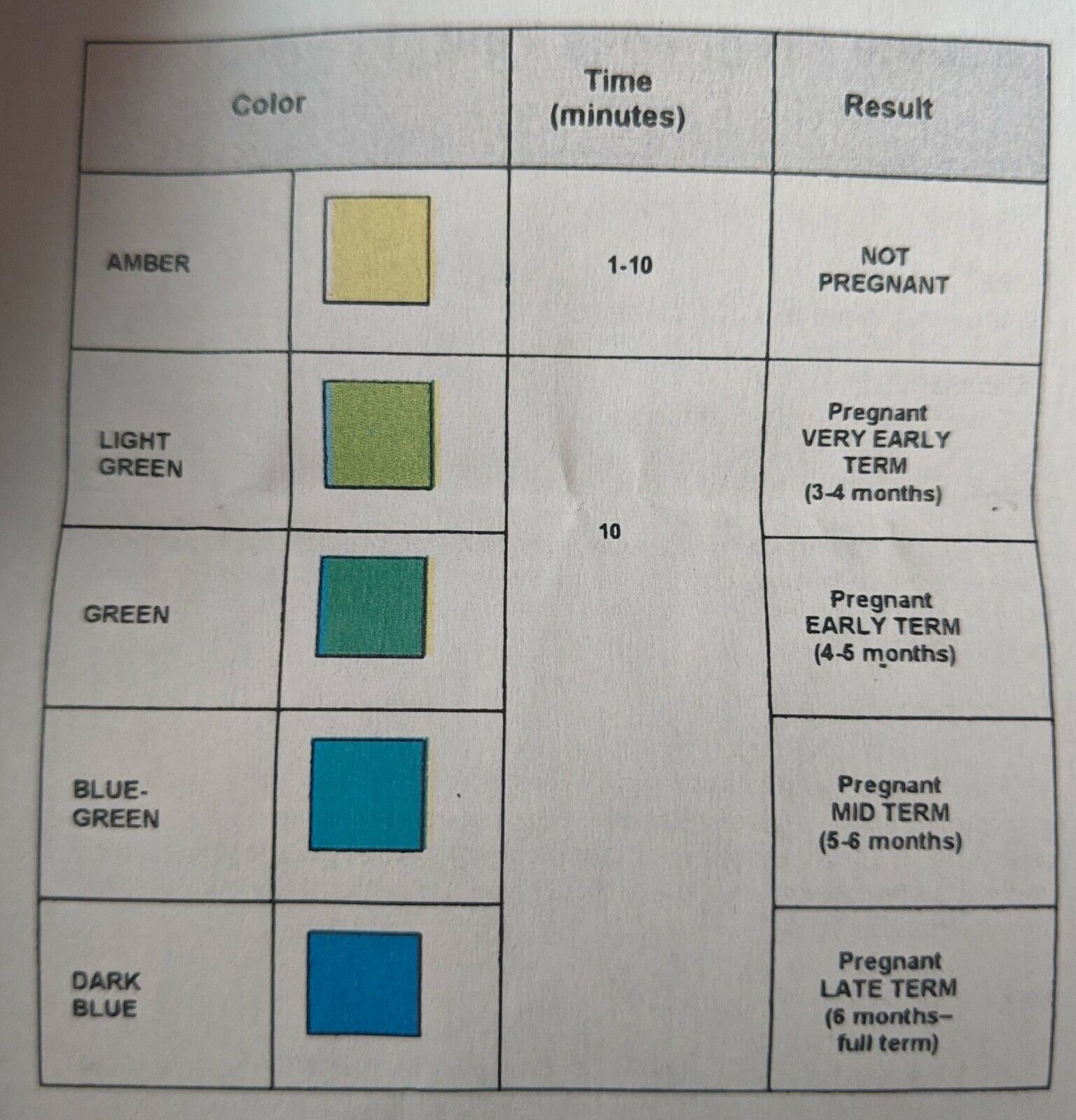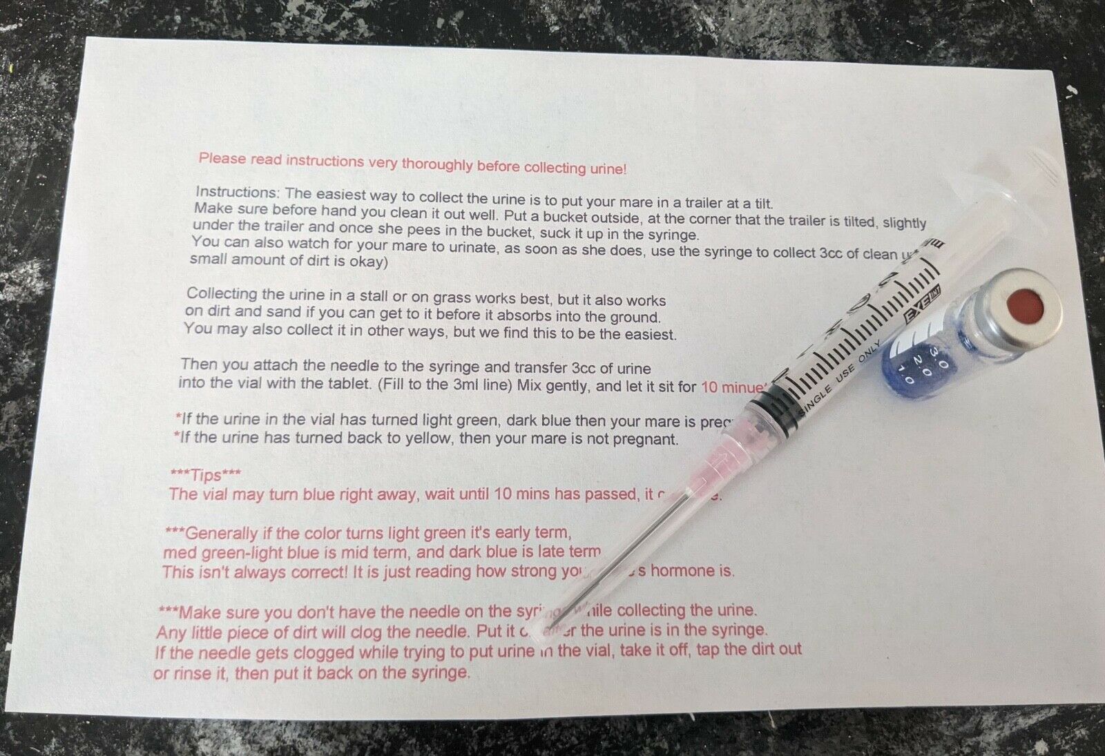 Please do not order unless you're in the US! (HI, AK, etc EXCLUDED. IT costs too much to ship. Thank you! ) Horse Pregnancy Test: 95% Accurate! It's a simple test that works by rapid analysis of the pregnancy hormone estrone sulfate in urine using a simple colorimetric reaction. *The following conditions can show false positives (green/blue) to this test: -Estrus -non cycling, pubertal females -anoestrus female -retained corpus lutei -testing within 3 weeks after parturition -testing of suckling foal -fetal loss of fetal absorption -urinary tract infections *The following conditions can show false negatives (yellow) to this test: -cystic ovarian disease -placentitus -severe stress -contamination Instructions: Please read instructions very thoroughly before collecting urine! Instructions: The easiest way to collect the urine is to put your mare in a trailer at a tilt. Make sure before hand you clean it out well. Put a bucket outside, at the corner that the trailer is tilted, slightly under the trailer and once she pees in the bucket, suck it up in the syringe. You can also watch for your mare to urinate, as soon as she does, use the syringe to collect 3cc of clean urine. (a small amount of dirt is okay) Collecting the urine in a stall or on grass works best, but it also works on dirt and sand if you can get to it before it absorbs into the ground. You may also collect it in other ways, but we find this to be the easiest. Then you attach the needle to the syringe and transfer 3cc of urine into the vial with the tablet. (Fill to the 3ml line) Mix gently, and let it sit for 10 minuets . * If the urine in the vial has turned light green, dark blue then your mare is pregnant. * If the urine has turned back to yellow, then your mare is not pregnant. ***Tips*** The vial may turn blue right away, wait until 10 mins has passed, it can fade. ***Generally if the color turns light green it's early term, med green-light blue is mid term, and dark blue is late term. This isn't always correct! It is just reading how strong your mare's hormone is. ***Make sure you don't have the needle on the syringe while collecting the urine. Any little piece of dirt will clog the needle. Put it on after the urine is in the syringe. If the needle gets clogged while trying to put urine in the vial, take it off, tap the dirt out or rinse it, then put it back on the syringe.
