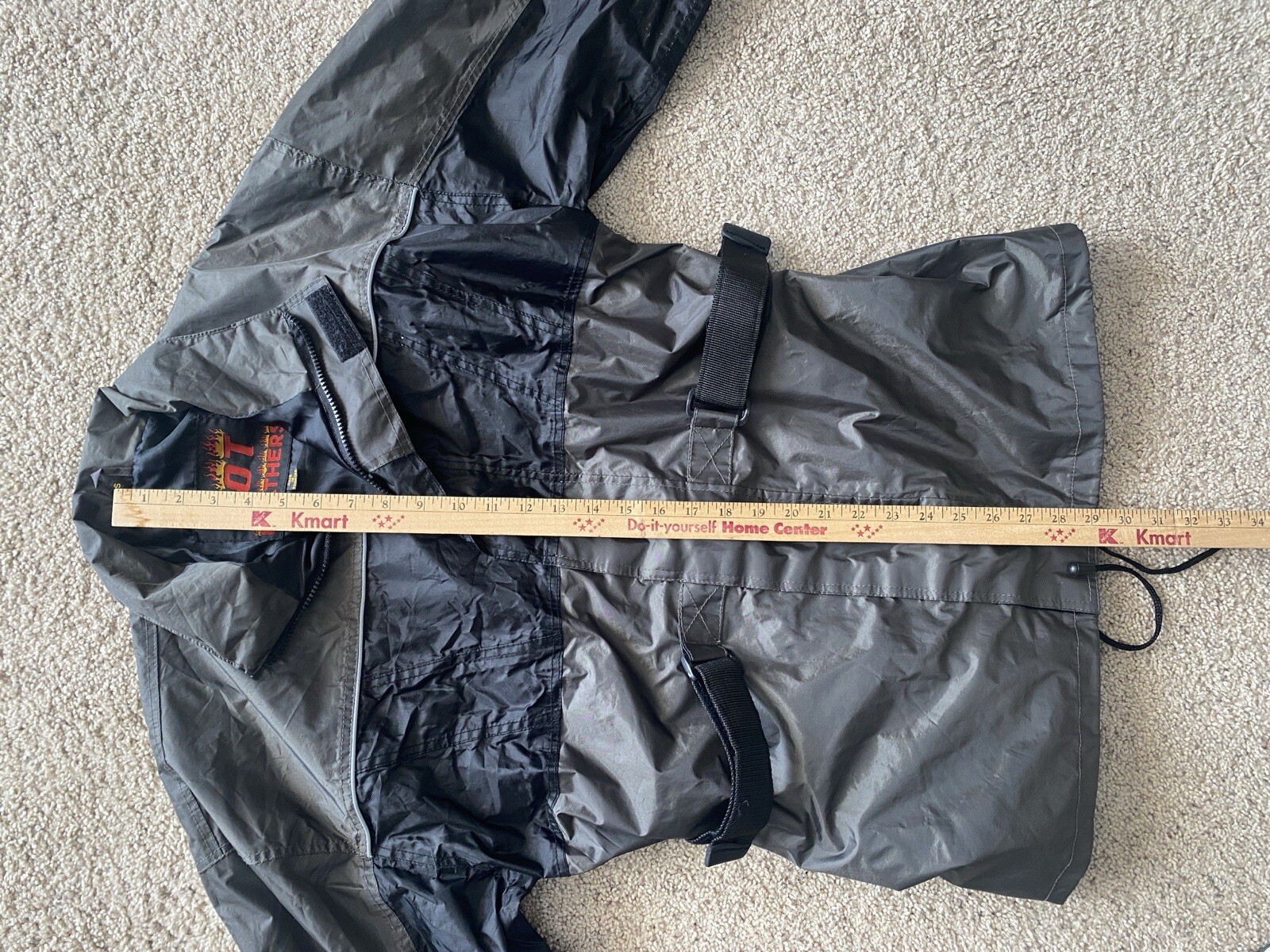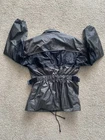 Nice waterproof jacket- it is not leather The brand is Hot Leathers Size S - i suppose it could be unisex Check photos for measurements and style Back waist elastic with hook & loop straps to tighten Bottom drawstring Comes with a bag to store it in which has a carry loop on the corner Preowned- it has some light white spots at a few places like arms, and such, pretty unnoticeable to the average eye