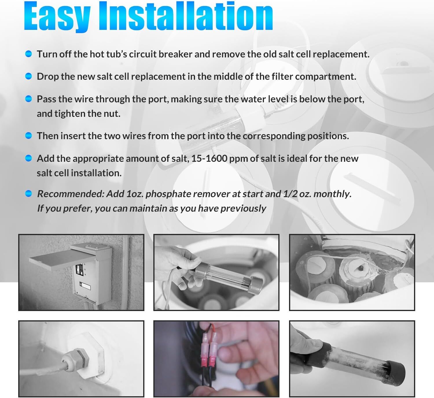 Feature Wide Compatibility with ACE Saltwater Systems:The Scepter Salt Cell Replacement (76078) is designed for use with HotSpring spas equipped with ACE saltwater systems. It ensures consistent chlorine generation and efficient water quality maintenance, making it a reliable choice for spa owners. Compatible with Hot Spring Models (2009-Present):This replacement cell fits a range of HotSpring spa models from 2009 to the present, including Grandee, Envoy, Jetsetter, Vanguard, Prodigy, and Sovereign, ensuring seamless installation and optimal performance. 76078 Scepter Salt Cell 1HTWSEP01 Fits Hot Spring ACE Systems & Limelight Spas Feature Wide Compatibility with ACE Saltwater Systems: The Scepter Salt Cell Replacement (76078) is designed for use with HotSpring spas equipped with ACE saltwater systems. It ensures consistent chlorine generation and efficient water quality maintenance, making it a reliable choice for spa owners. Compatible with Hot Spring Models (2009-Present): This replacement cell fits a range of HotSpring spa models from 2009 to the present, including Grandee, Envoy, Jetsetter, Vanguard, Prodigy, and Sovereign, ensuring seamless installation and optimal performance. Compatible with Limelight Models (2009-Present): The Scepter Salt Cell Replacement (76078) is also compatible with Limelight spa models from 2009 onward, including Bolt, Pulse, Gleam, Flair, and Glow, providing an excellent replacement option for these ACE-equipped models. Enhanced Design for Longer Lifespan: Redesigned structure with 25% more plate area, the Scepter Salt Cell Replacement provides increased efficiency and a longer service life. This enhanced design ensures reliable chlorine production for extended periods. Simple Installation Process: Is designed for easy installation, allowing for a straightforward DIY replacement. No special tools or professional help are required, saving you money and time while ensuring a hassle-free experience. Versatile Compatibility:Designed to work in both residential and commercial saltwater systems, is suitable for a variety of pool sizes and conditions, ensuring that it meets the needs of both small and large installations. Promotes Clean, Clear Water:The Scepter Salt Cell Replacement helps maintain clean and clear water in your hot tub, ensuring that it stays fresh and free of impurities. This replacement part supports the system’s ability to maintain high water quality and hygiene. High-Quality Materials:Made from durable and corrosion-resistant materials, is built to last. It withstands the demands of saltwater systems, providing long-term performance and reliability. Product Description Compatible Systems: ACE Saltwater System Cell Type: Salt Cell for Chlorine Generation Material: High-Quality Materials for Long-Term Performance Installation: Easy plug-and-play installation for DIY use Seal Type: Includes pass-through fitting cable seal for secure installation Ideal Salt Level for Installation: 1500-1600 ppm Compatible with Hot Spring Models: Fit for Hot Spring Grandee (2009-Current) Fit for Hot Spring Vista (2009-2013) Fit for Hot Spring Envoy (2009-Current) Fit for Hot Spring Vanguard (2009-Current) Fit for Hot Spring Grandee NXT (2014-Current) Fit for Hot Spring Envoy NXT (2014-Current) Fit for Hot Spring Jetsetter NXT (2014-Current) Fit for Hot Spring Jetsetter (2009-Current) Fit for Hot Spring Prodigy (2009-Current) Fit for Hot Spring Sovereign (2009-Current) Compatible wit Limelight Models: Fit for Limelight Bolt (2012-Current) Fit for Limelight Pulse (2009-Current) Fit for Limelight Gleam (2013-Current) Fit for Limelight Flair (2009-Current) Fit for Limelight Glow (2009-Current) Item Specifics Brand LUAUTO Model 76078 1HTWSEP01 Type Scepter Salt Cell Fitment For Hot Spring & Limelight Spas 2009-Present Custom Bundle No Color White Single item or set Single item Bundle Description No Feature Durable Product Dimensions 2 x 2 x 2 inches Item Weight 8.4 ounces Style Custom Compatible Systems ACE Saltwater System Payment 1. Payment methods accepted: Payoneer . Our Payoneer account allows you to pay by credit card, debit card and your paypal balance. 2. We ship items to Your Ebay address .Please make sure your Ebay address is correct before you pay, cause it cannot be changed once the order shipped out. 1. All major credit cards are accepted through our secure payment processor Paypal. 2. We ship items to Your Paypal address .Please make sure your Paypal address is correct before you pay, cause it cannot be changed once the order shipped out. 1. All major credit cards are accepted through our secure payment processor Paypal. 2. We ship items to Your Paypal address .Please make sure your Paypal address is correct before you pay, cause it cannot be changed once the order shipped out. 1. All major credit cards are accepted through our secure payment processor Paypal. 2. We ship items to Your Paypal address .Please make sure your Paypal address is correct before you pay, cause it cannot be changed once the order shipped out. 1. All major credit cards are accepted through our secure payment processor Paypal. 2. We ship items to Your Paypal address .Please make sure your Paypal address is correct before you pay, cause it cannot be changed once the order shipped out. 1. All major credit cards are accepted through our secure payment processor Paypal. 2. We ship items to Your Paypal address .Please make sure your Paypal address is correct before you pay, cause it cannot be changed once the order shipped out. 1. All major credit cards are accepted through our secure payment processor Paypal. 2. We ship items to Your Paypal address .Please make sure your Paypal address is correct before you pay, cause it cannot be changed once the order shipped out. 1. All major credit cards are accepted through our secure payment processor Paypal. 2. We ship items to Your Paypal address .Please make sure your Paypal address is correct before you pay, cause it cannot be changed once t