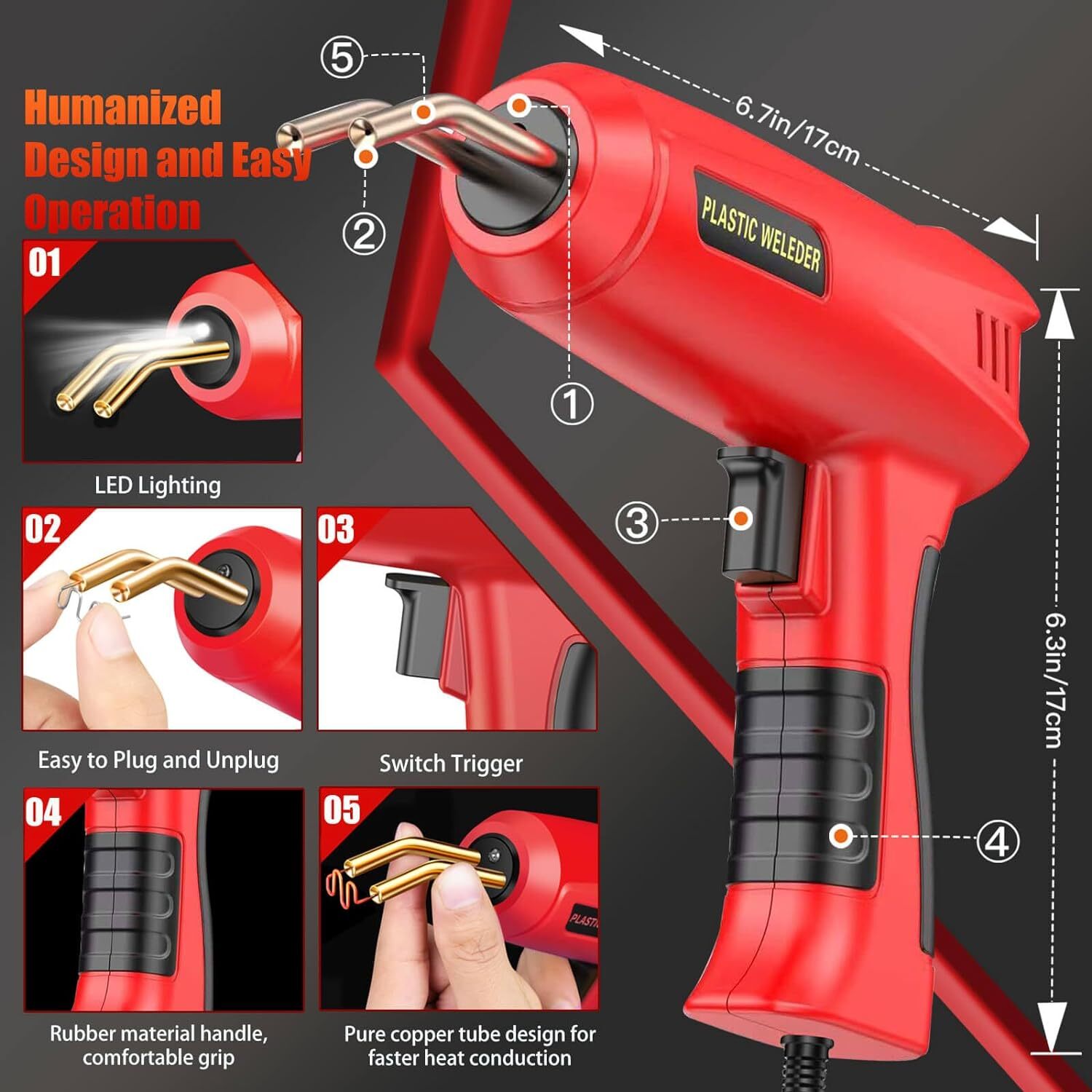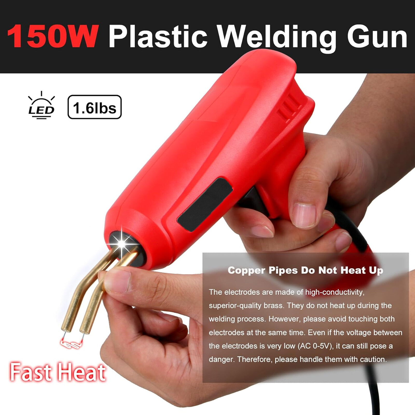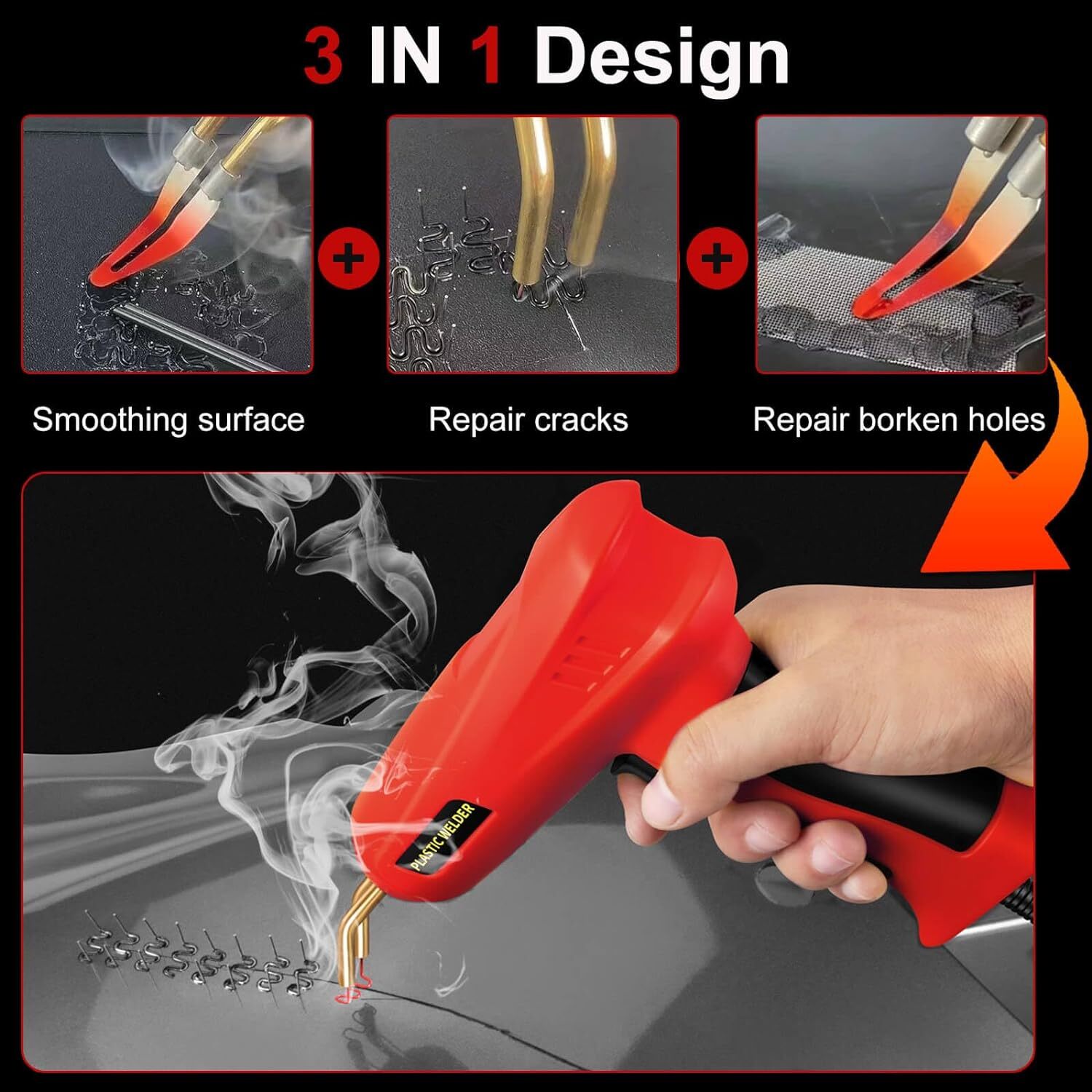 Feature 150W High-power Plastic repair Welder kit,Fast heating in 1-3 seconds,higher efficiency, more energy saving than most 50W and 70W on the market,It can save you a lot of time and quickly complete the maintenance project. It is suitable for the repair and reinforcement of automotive plastic parts, such as bumpers, dashboards, lamp holders, radiators, handles, headlights, plastic fins, and motorcycle plastic devices. Comes with 800PCS hot staples(200PCS 0.8mm wave staples,100PCS 0.6mm wave staples,100PCS 0.6mm flat staples,100PCS 0.8mm flat staples,150 0.6mm M staples,150 0.6mm V staples,)56 PCS Plastic Welding Rods,Meeting different repair needs. Our plastic welding machine bumper repair kit adopts LED light design, which is convenient for dark working environment. Has a safety overheating conservation function. Ensure equipment safety and prevent fires.The plastic welding kit has anti scald conservation function,firm welding,easy operation and portability. Specifications: Plug type:US For optional Line length:1.55M Wattage:150W Voltage:11V Package List: 1XPlastics Welding Machin 200PCS 0.8mm wave staples 100PCS 0.6mm wave staples 100PCS 0.6mm flat staples 100PCS 0.8mm flat staples 150PCS 0.6mm M staples 150PCS 0.6mm V staples, 1Xknife 1XPliers 2xScraper 56 PCS Plastic Welding Rods 1XUser Manual