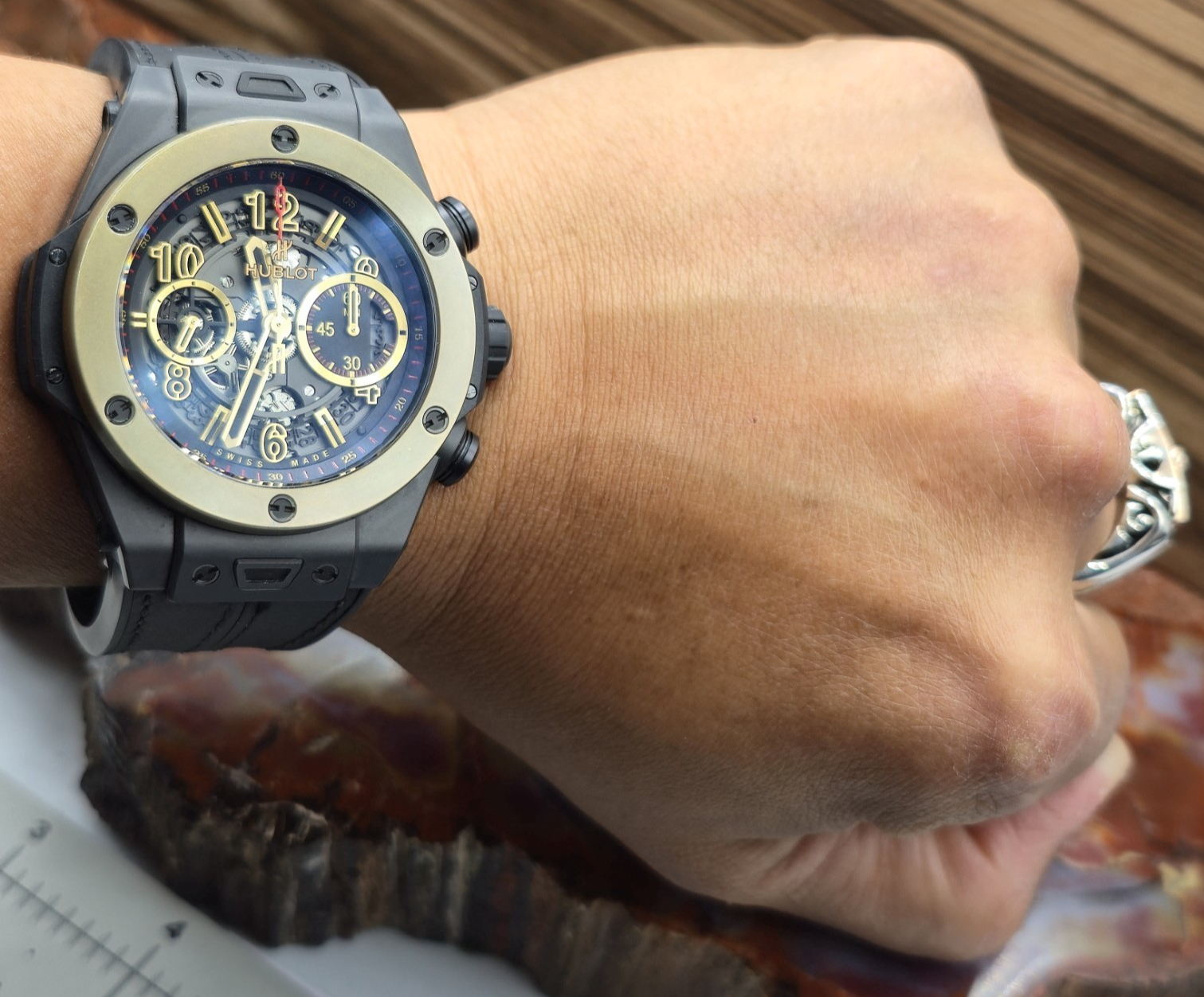 Hublot Big Bang Unico Magic Gold Black Ceramic/Titanium 45mm 411.CM.1138.RX Low Price. This is an awesome watch to wear. I've worn it for a couple of weeks . Looks and runs great. No paperwork, lost during the move. I will add a travel case for the watch. I see other sellers selling similar types . Mine has the black bezel bolts and the bezel is mint condition. Please review picture to avoid returns. ITEM050925PO6000