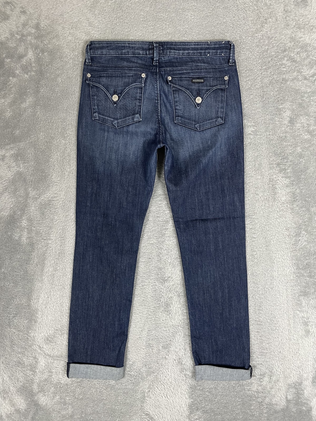Hudson Jeans Womens 29 Blue Bacara Straight Flood Cuff Stretch Denim Condition: Gently worn, no visible flaws. All buttons and zipper functional. Material: 88% cotton, 10% polyester, 2% spandex for a comfortable, stretchy fit Style: Bacara Straight Flood Cuff, style # NW658ZNA, color # PSMO, cut # 8403-00 Classic five-pocket design with signature Hudson logo metal rivets and back flap pockets Medium-dark blue wash with intentionally faded detailing and rolled cuffs for a modern look Hudson brand patch at back Made in Mexico Tag size: 29 (Womens) See images for measurements of waist, rise, inseam, and leg opening to confirm fit