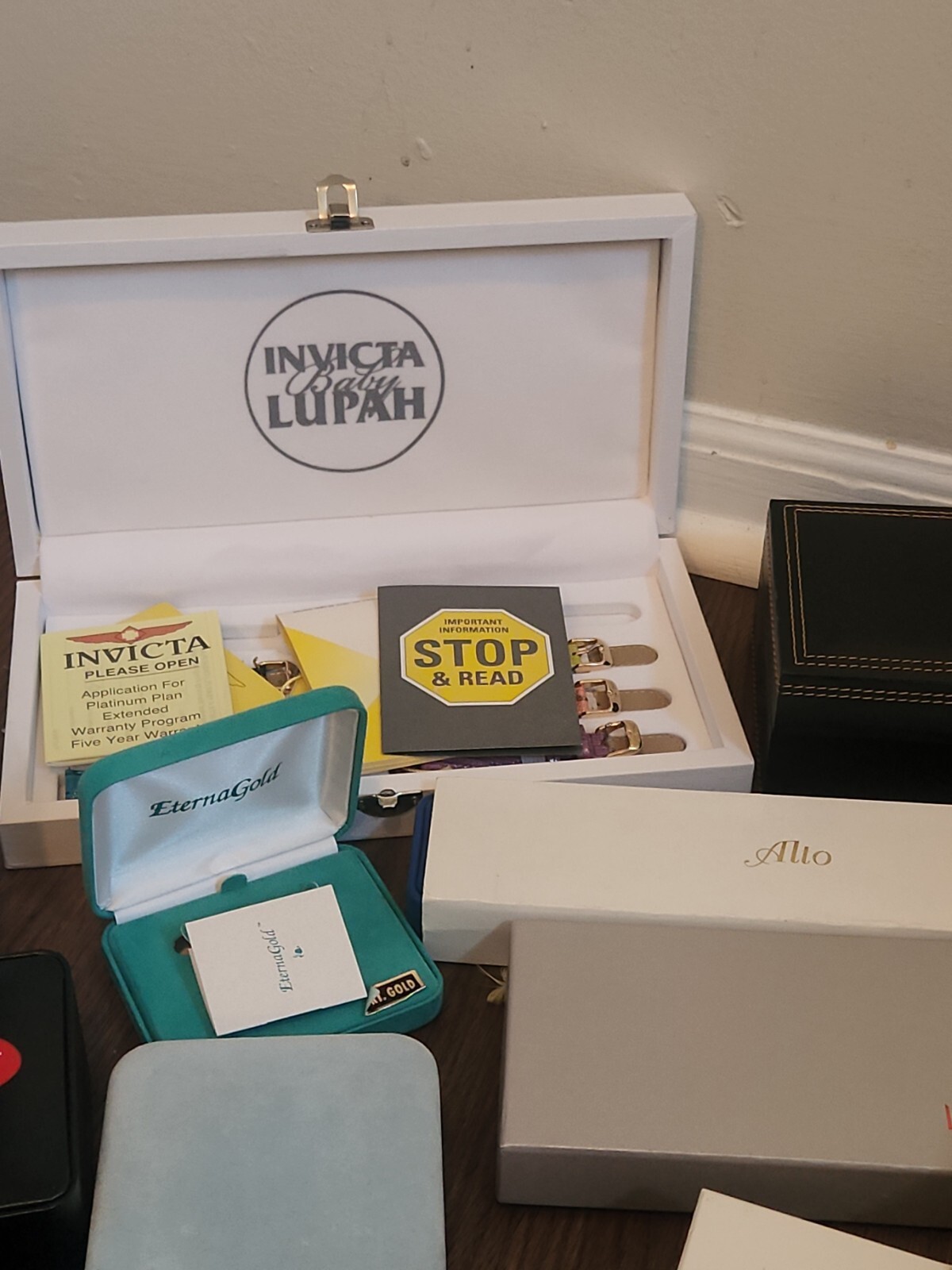 Watch, ring, jewelry boxes. Large lot around 50 pieces. Brands include Invicta, Alto, Genevex, Eternagold, Beverly Hills Gold, Peugeot, Pierre Jacquard, Akribos, and more. Lot is sold as is.